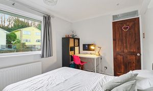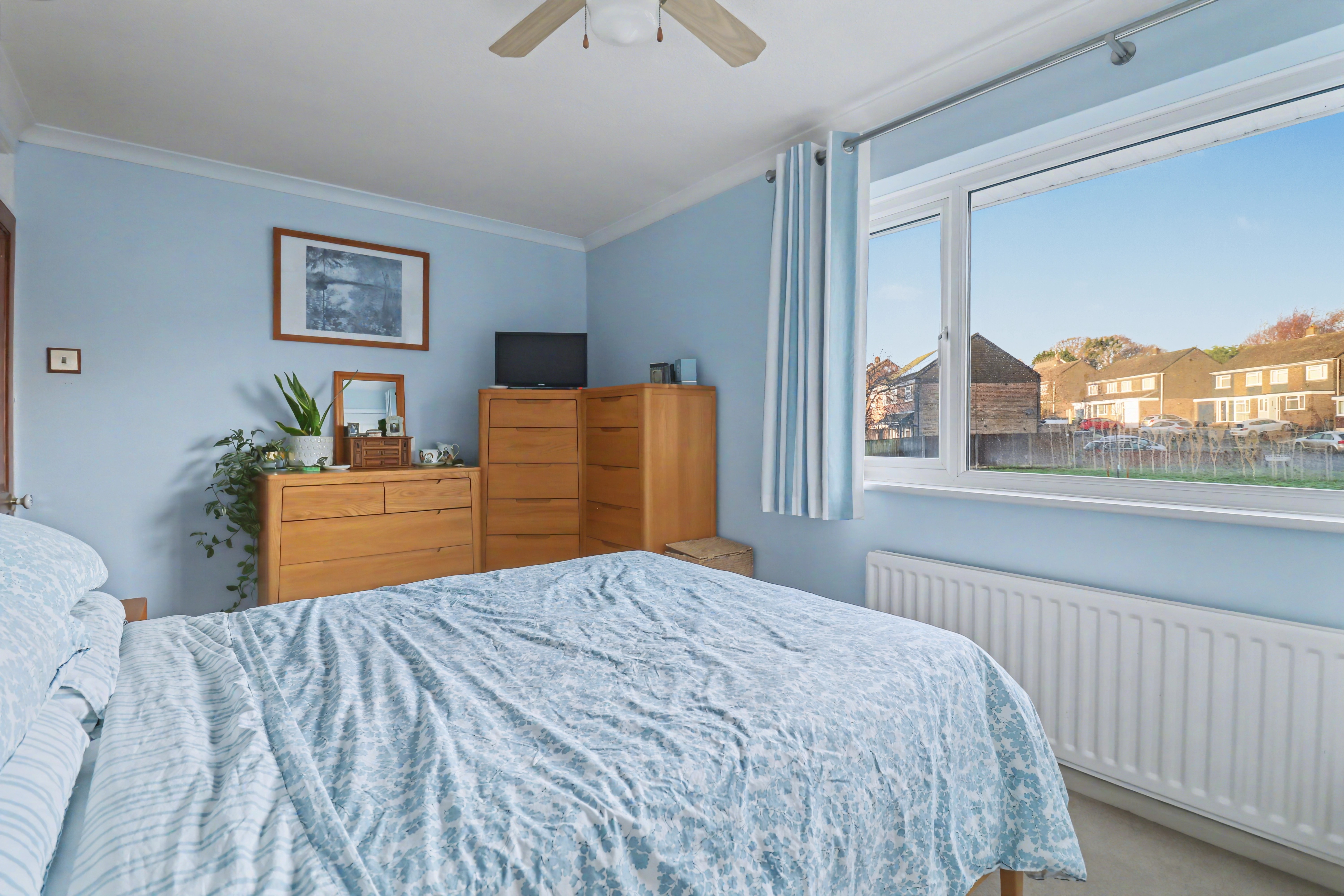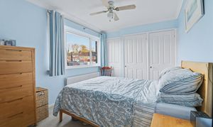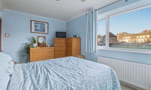 The good-sized master bedroom faces the front of the property and has fitted wardrobes to one wall, as well as an airing cupboard. The second bedroom is also a double room and overlooks the rear garden, whilst bedroom three is an L-shaped room with a window to the front.