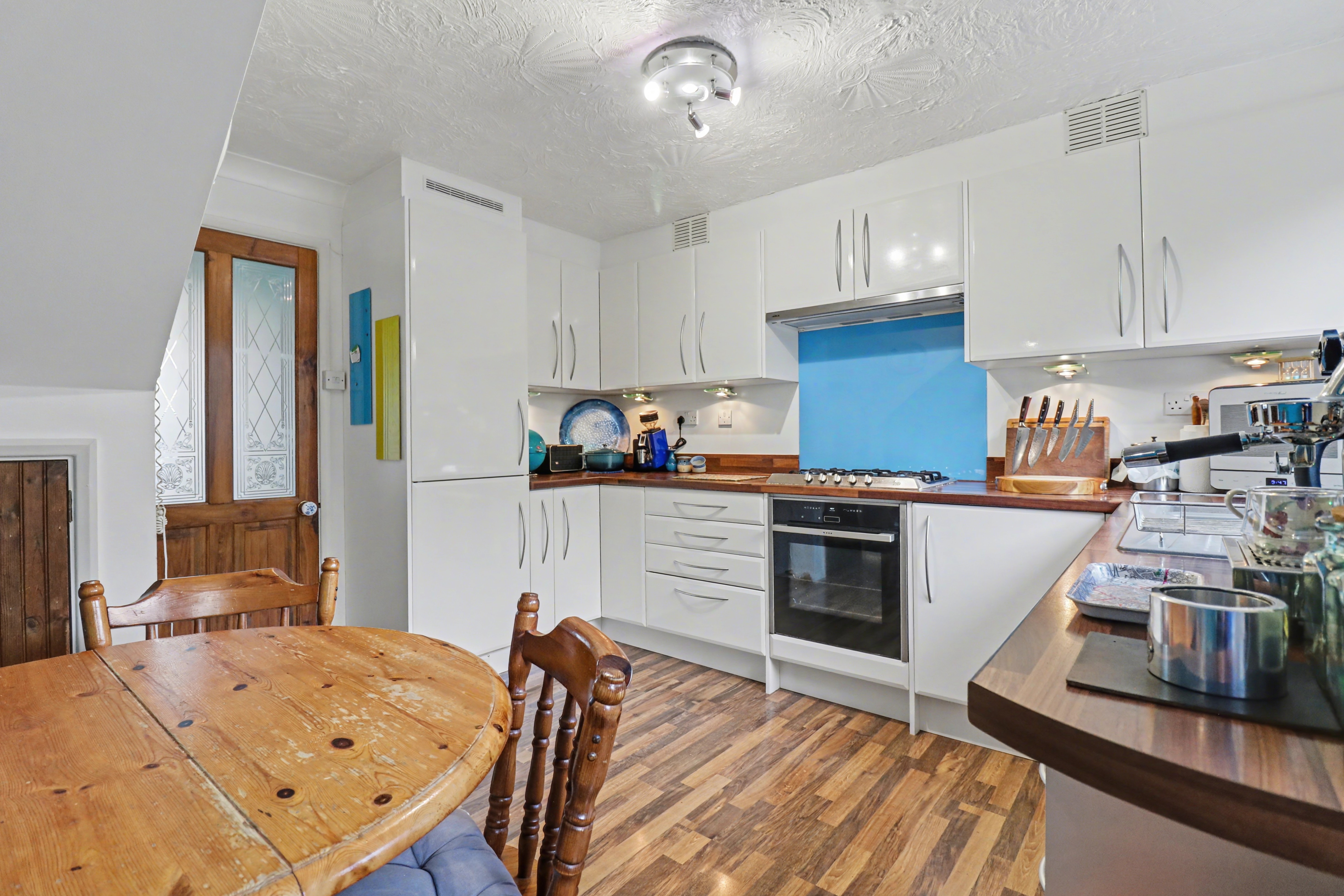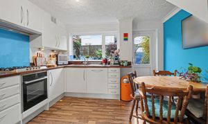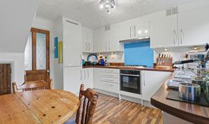 The kitchen/diner has been fitted with a modern range of wall and base units with a built-in in oven and gas hob with extractor over, as well as integrated appliances including a fridge/freezer, dishwasher and washing machine. There is also an understairs storage cupboard, a window to the rear and a door leading out to the garden.