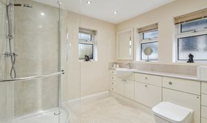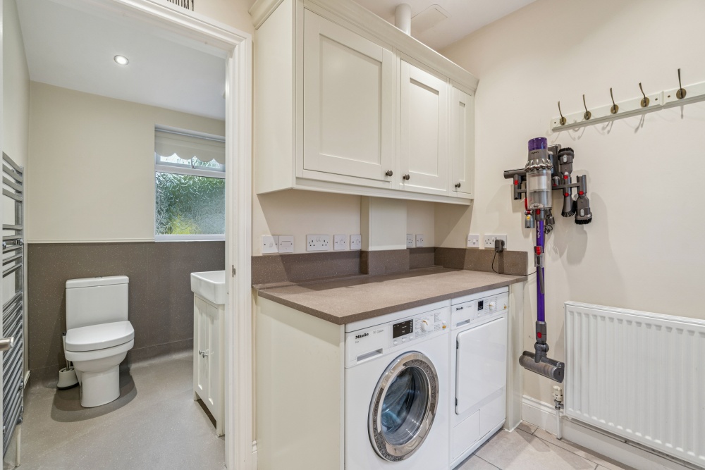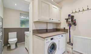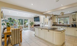 Inside, the spacious open-plan kitchen/dining/family room provides an inviting social space, complete with bi-folding doors that open seamlessly to the rear garden. There is also an entrance hall, a separate sitting room, a utility room, and two stylish bath or shower rooms arranged across both floors.