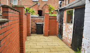 Paved courtyard rear garden with two outside stores, gate to rear access, walled perimeter.