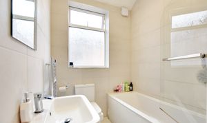 With double glazed window to the side elevation, bath with electric shower over, low-level WC, wash hand basin, tiled walls, extractor fan, tiled floor, heated chrome towel rail.