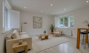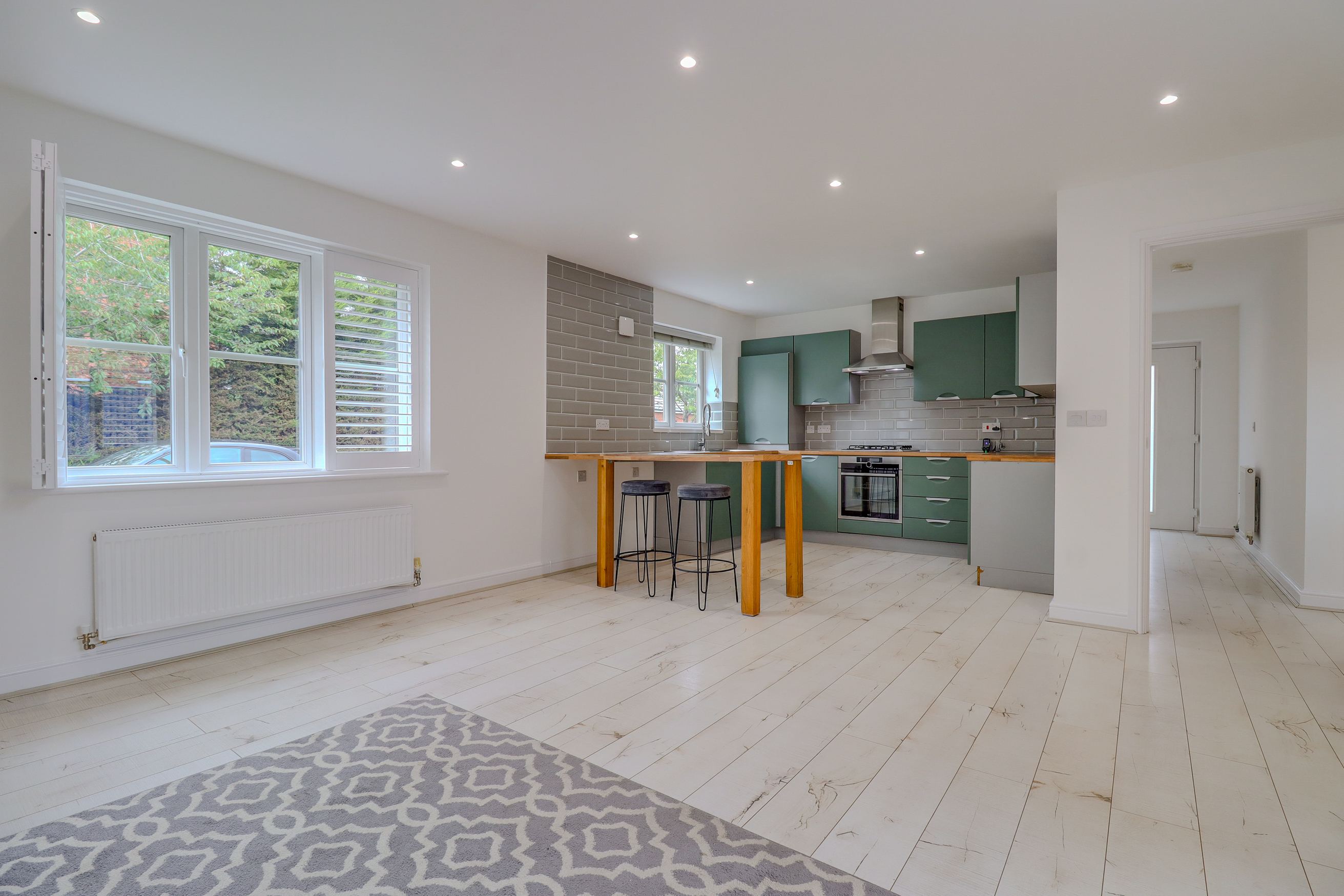 At the far end, the space opens into a bright open-plan lounge, dining, and kitchen area. This sociable hub of the home is filled with natural light, offering flexibility for everyday living and entertaining.