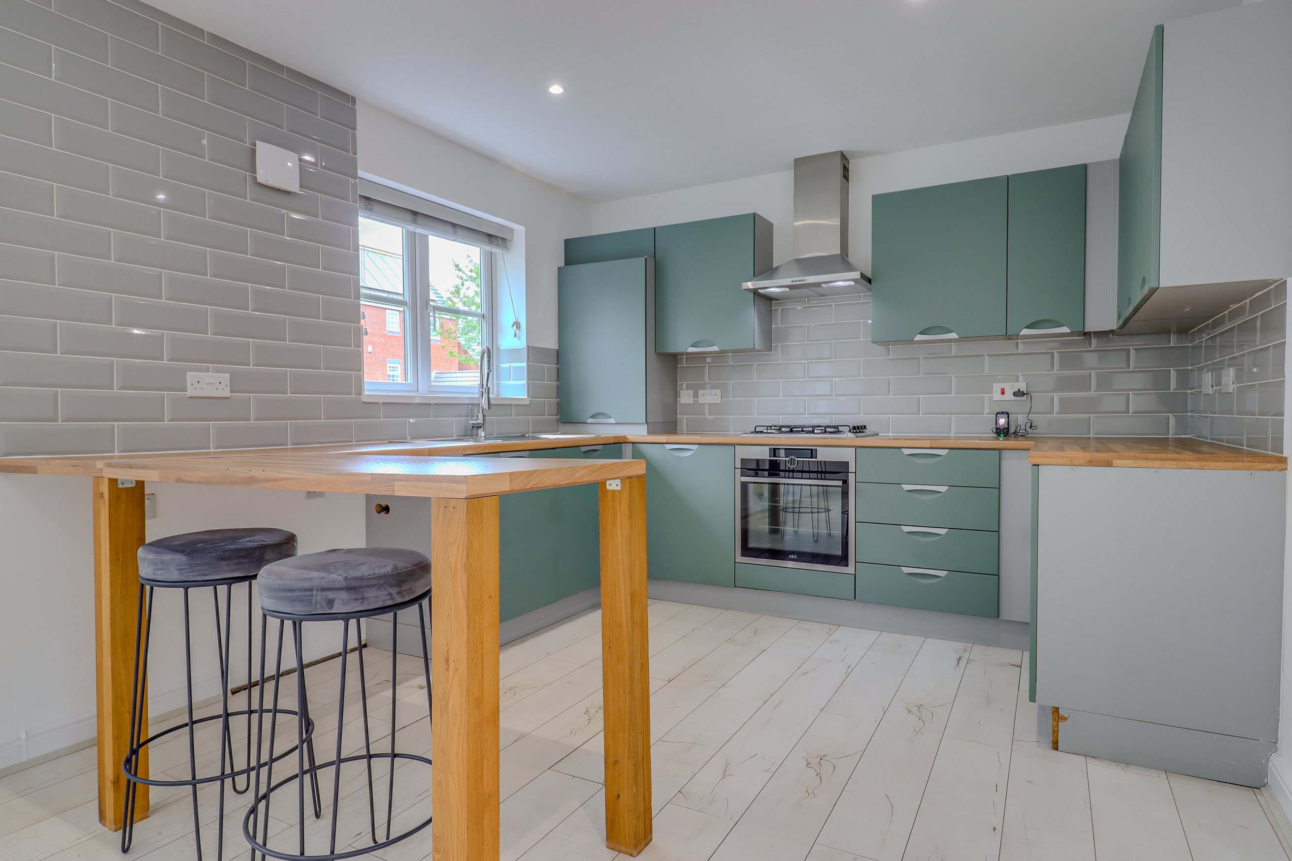 Sleek fitted kitchen with Rangemaster sink/tap and self-cleaning AEG oven