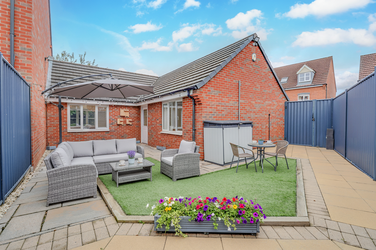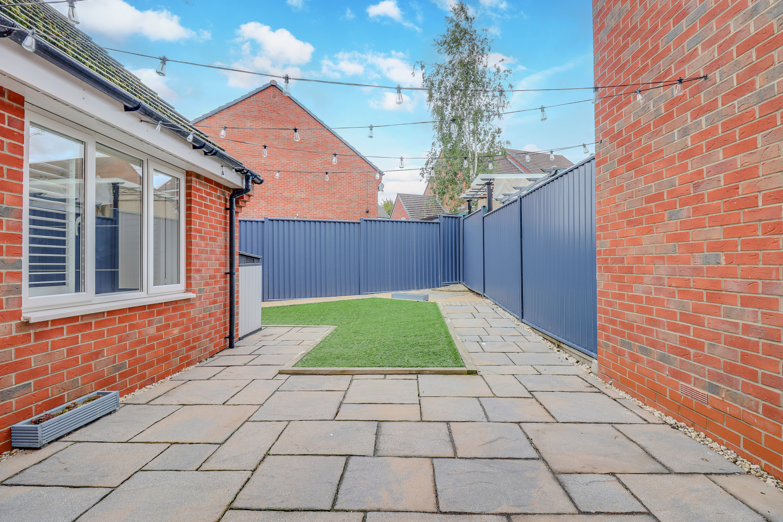 The front and rear gardens have been designed for minimal upkeep, with year-round greenery provided by artificial turf. Durable Colourfence panels ensure privacy and a neat finish. Outdoor power points, a water tap, garden lighting, and security lights complete the setup, making the space practical as well as attractive.