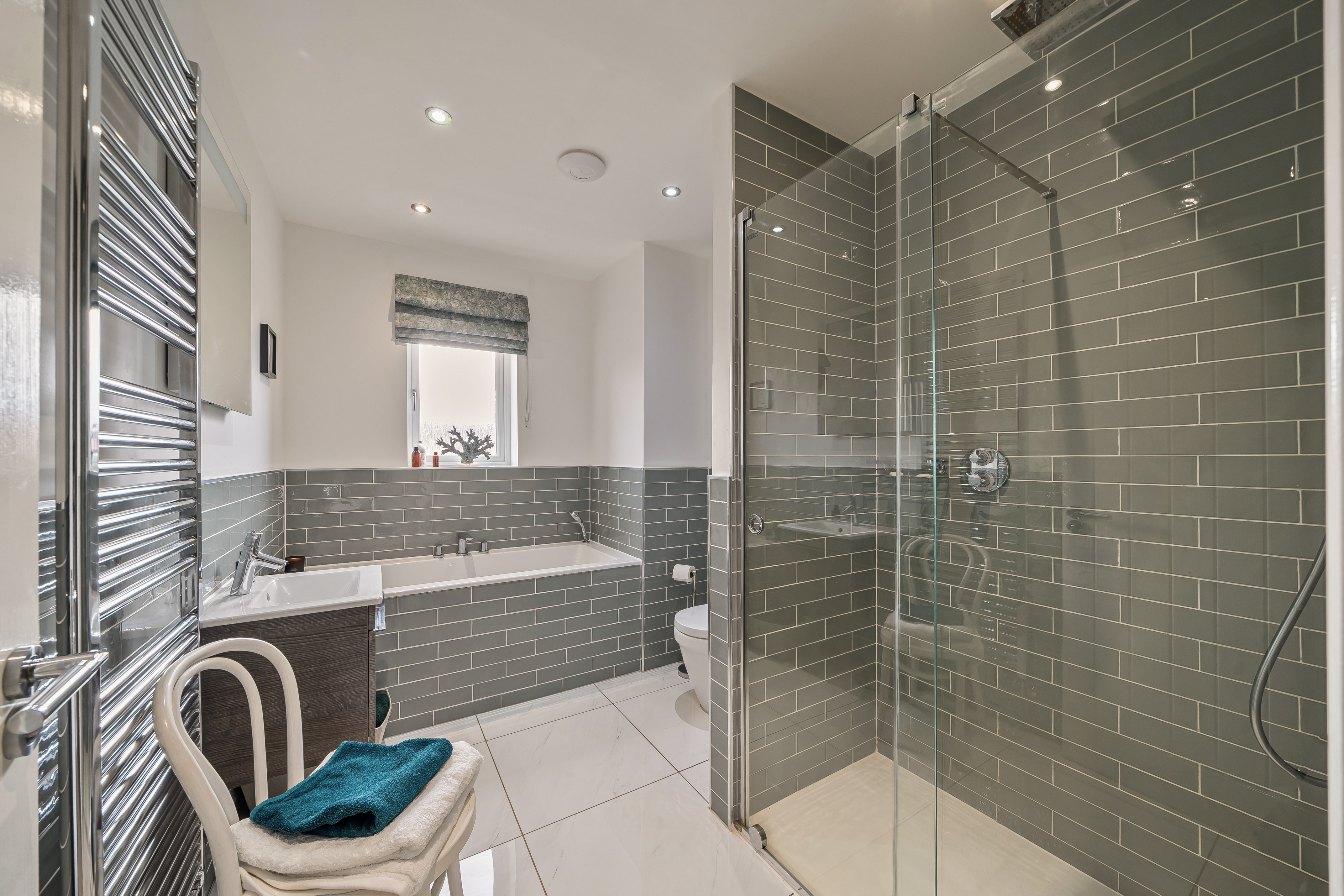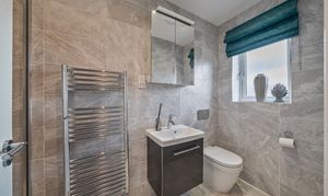Upstairs, the property offers five generous double bedrooms, four of which include extensive built-in wardrobes. Two bedrooms enjoy stylish en-suite shower rooms, while the modern family bathroom features both a bath and a walk-in shower.