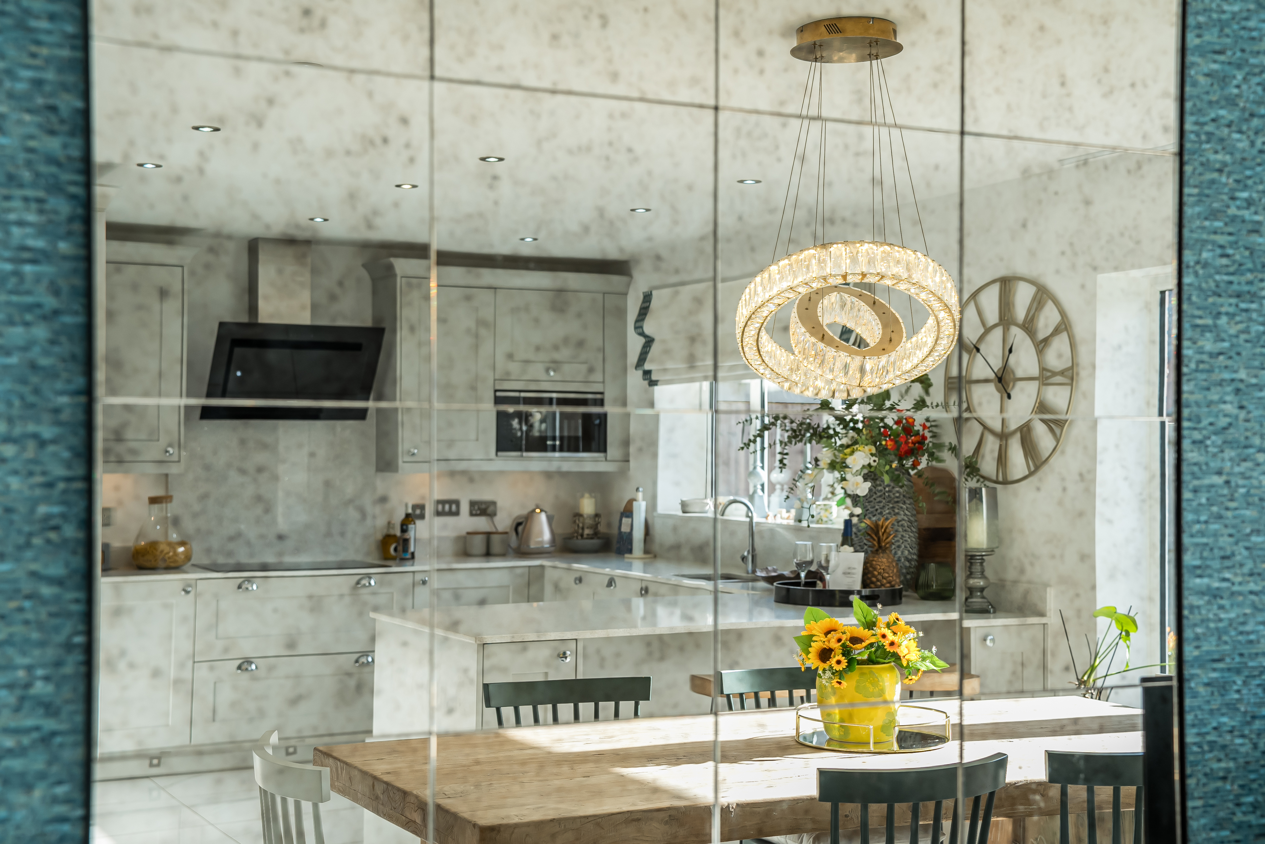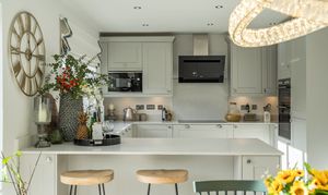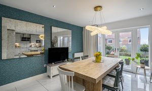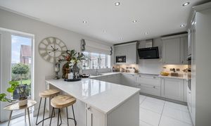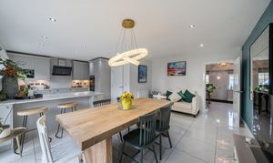 The kitchen/diner is the true heart of the home—flooded with natural light and finished with sleek white tiled flooring. It features a breakfast bar, ample space for a large dining table, and modern fittings ideal for family living and entertaining.