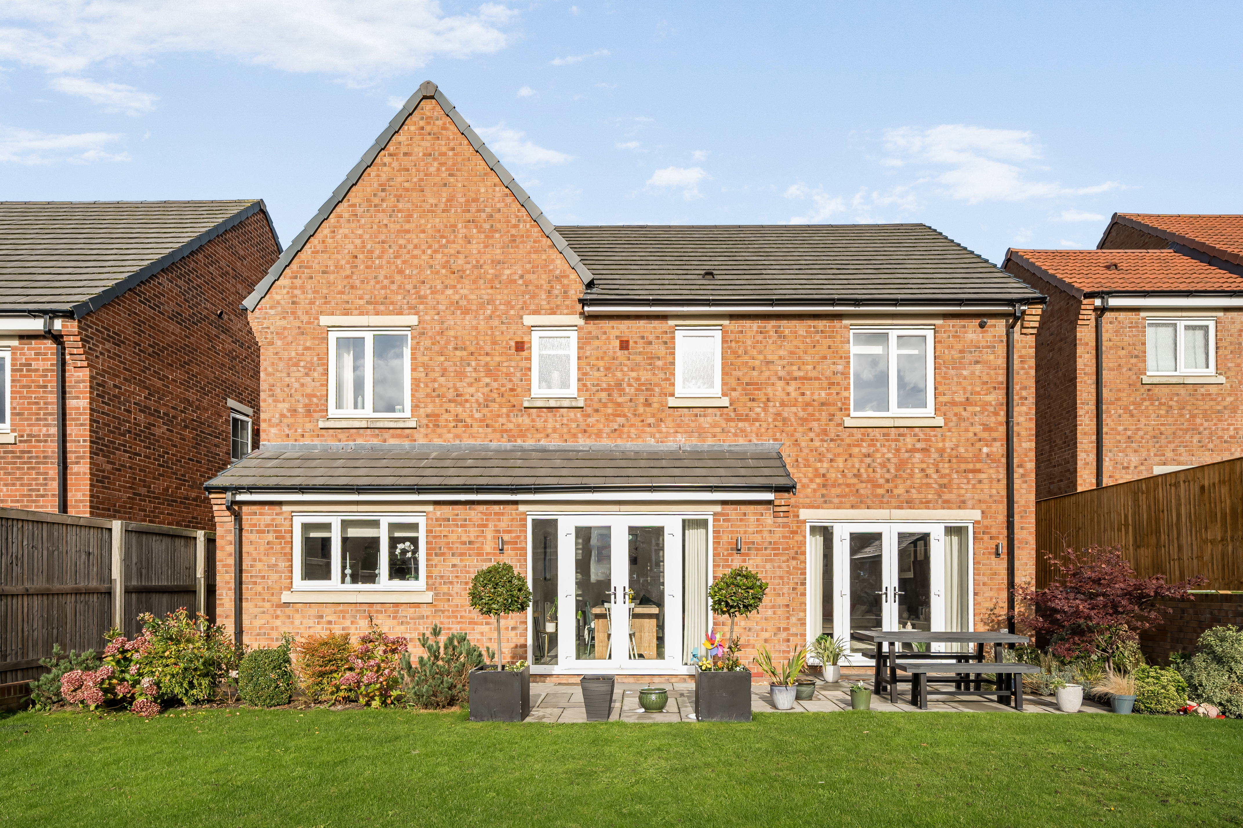 Both the reception room and kitchen open through double doors onto the beautifully landscaped rear garden, complete with a paved patio seating area and a large lawn bordered by planting beds and tall fencing for privacy.