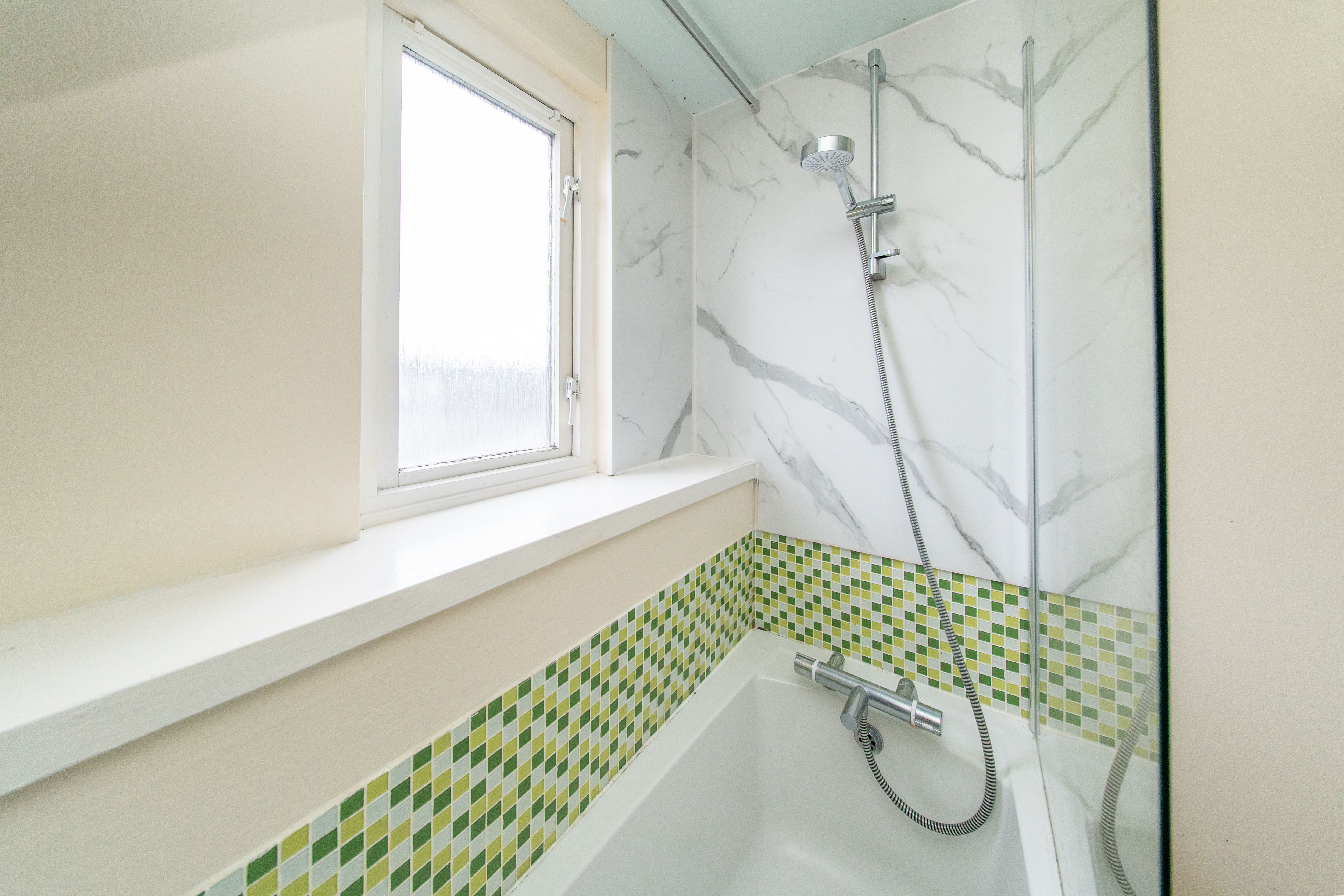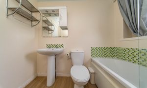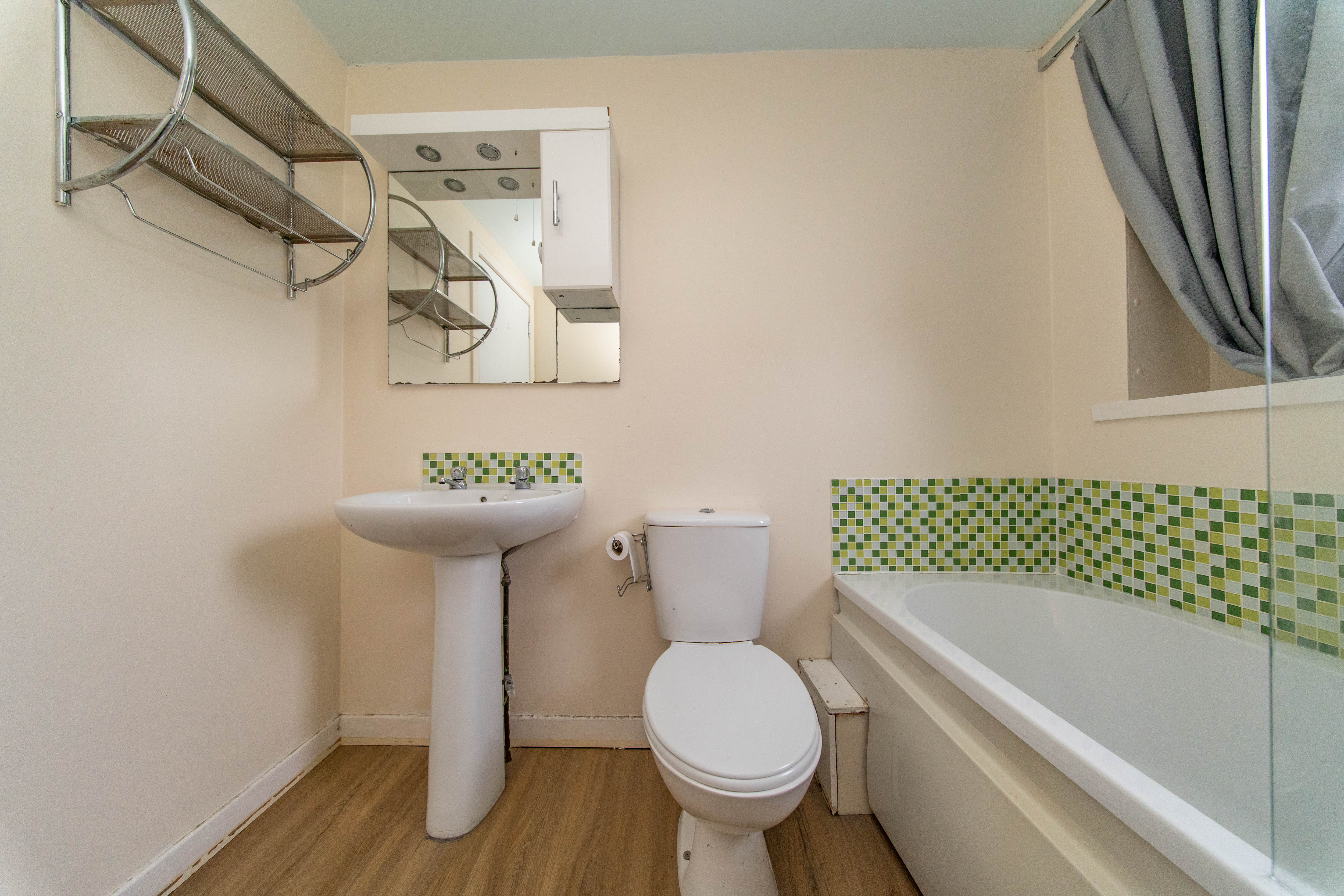 Spacious Bathroom comprising of bath with handheld mains operated shower, sink and toilet. There is one central light fitting, painted walls with tiling and wet wall sections, opaque window and laminate flooring.