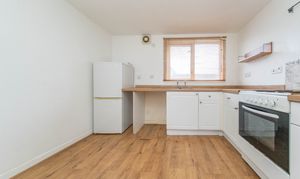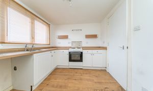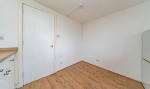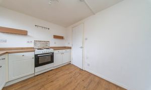 Good-sized kitchen offering ample worktop and storage space. Fitted with white base units, wood-effect worktops, stainless-steel sink, tile splashback, boiler and space for white goods. There is one central light fitting, painted walls, one window and laminate flooring.