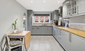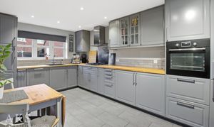 “I think this is such a lovely home with so much to offer. It has great kerb appeal with a tandem driveway, a single garage and further parking has been created across the front too. As you step inside, the hallway is a bright and welcoming space which leads through into both the living room and kitchen which both run from the front to the rear of the home, creating very spacious rooms! The living room is a light and bright room with the window to the front and double doors to the back letting in lots of natural light. The kitchen is a modern space with integrated appliances and a stylish finish, with the benefit of a boiling water tap too. I really love the glass door in some of the top units, perfect for displaying glassware. There’s plenty of room for a family dining table and access into a utility room where there’s further storage and a door out to the garden. There’s a guest WC downstairs too which is always handy.