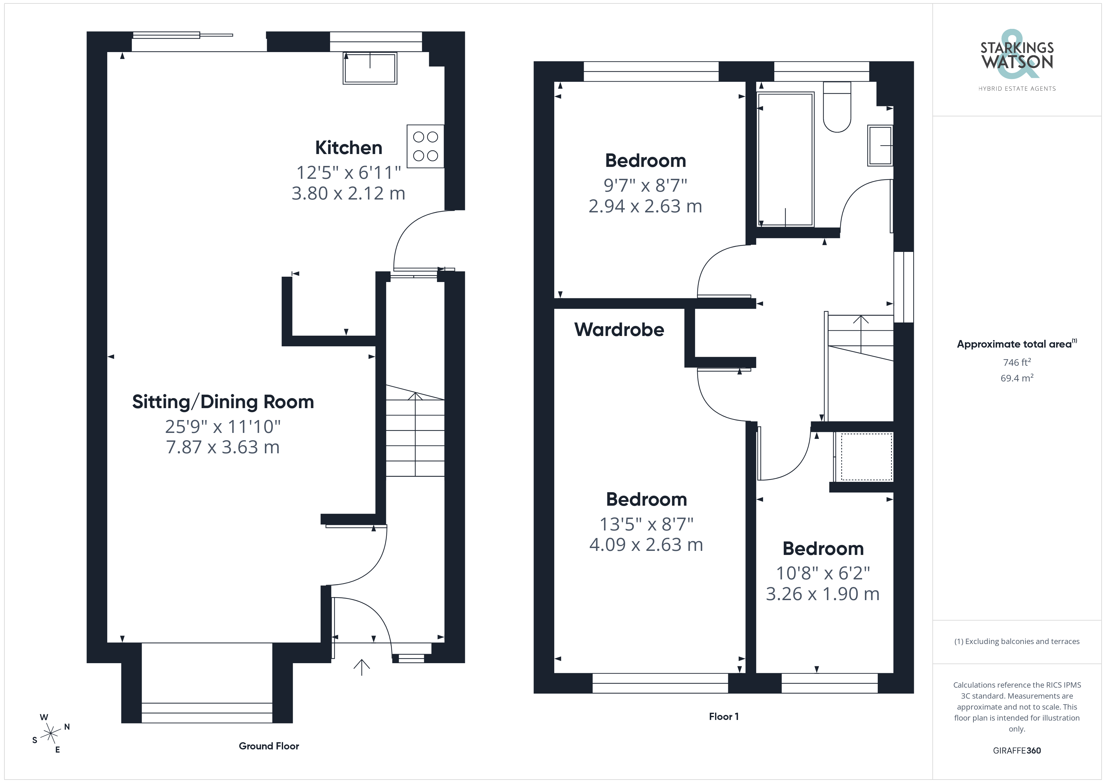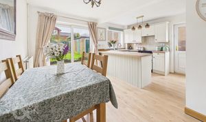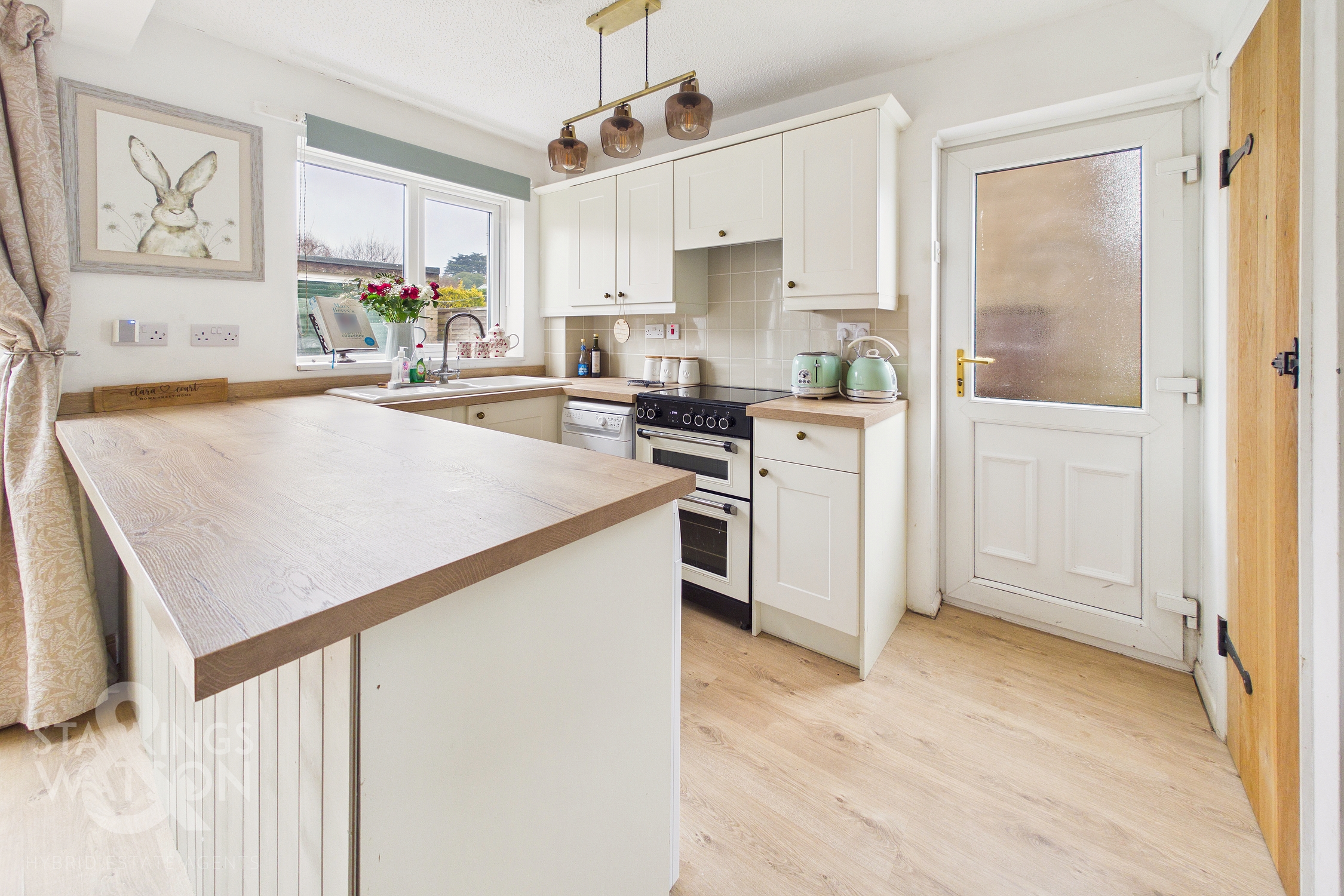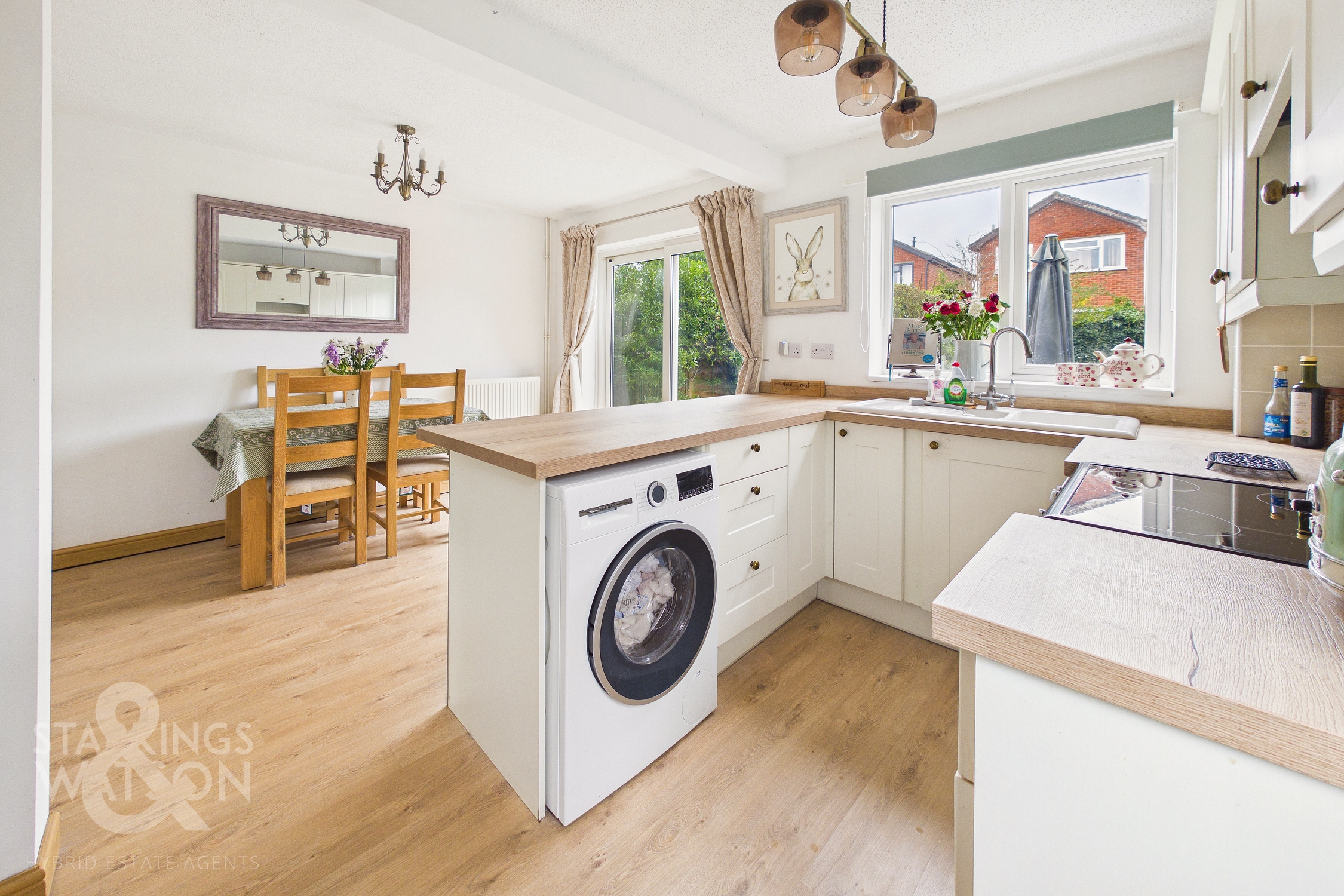 Once inside, the hall entrance offers the ideal meet and greet space with stairs rising to the first floor landing, with ample space for coats and shoes, and an attractive timber latch and brace door taking you to the adjacent sitting room. With dual aspect views to front and rear, the sitting room offers wood flooring underfoot with ample space for soft furnishings and a dining table, whilst being fully open plan to the kitchen. Sliding patio doors lead out to the garden, whilst the kitchen itself offers a u-shaped arrangement of wall and base level units including a breakfast bar, and space for general white goods including a freestanding electric cooker, washing machine, fridge, freezer and dishwasher. Tiled splash-backs run around the work surface, with wood flooring flowing underfoot and a window and door taking you to the outside. A built in storage cupboard can be found under the stairs.