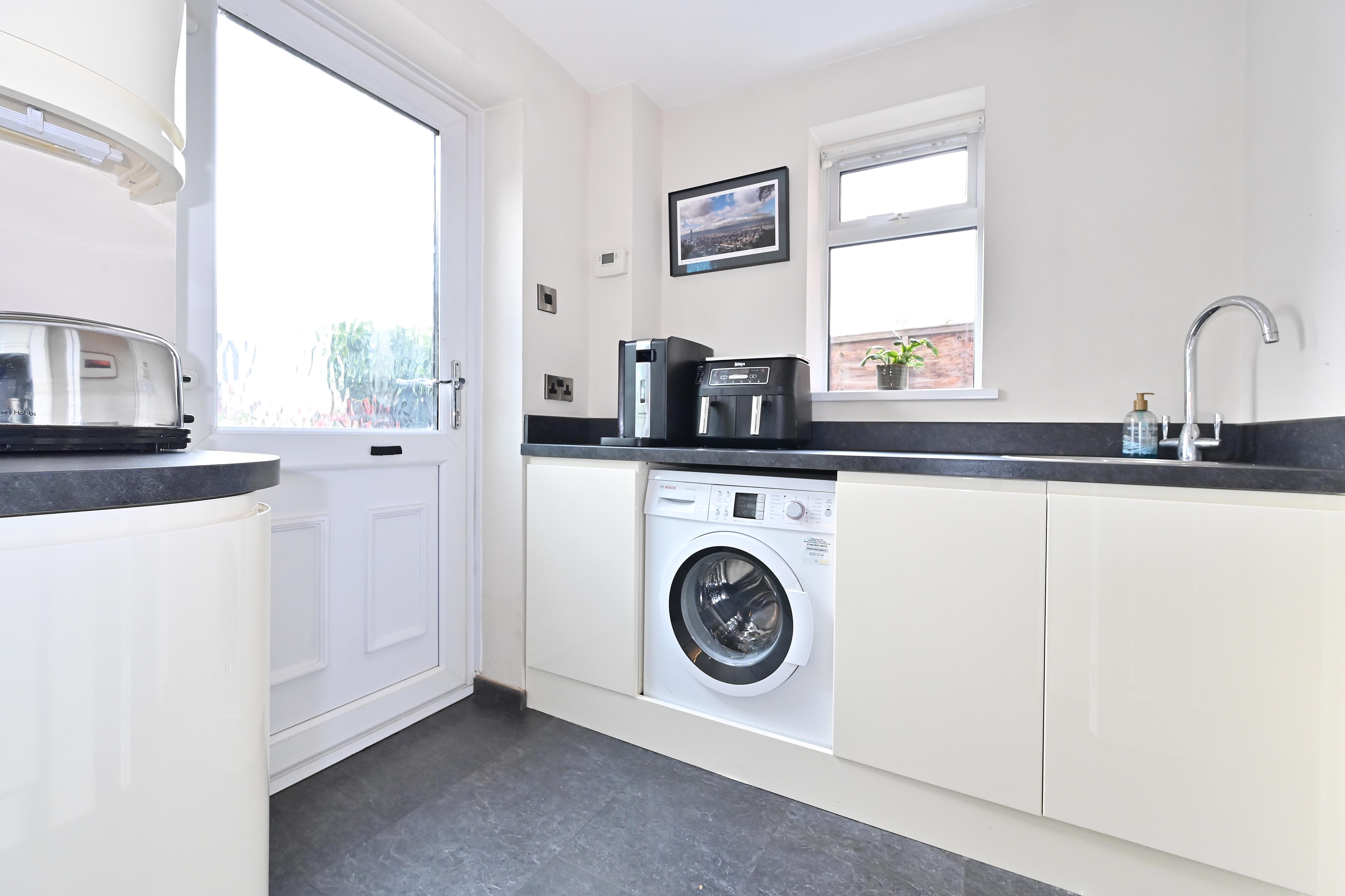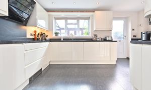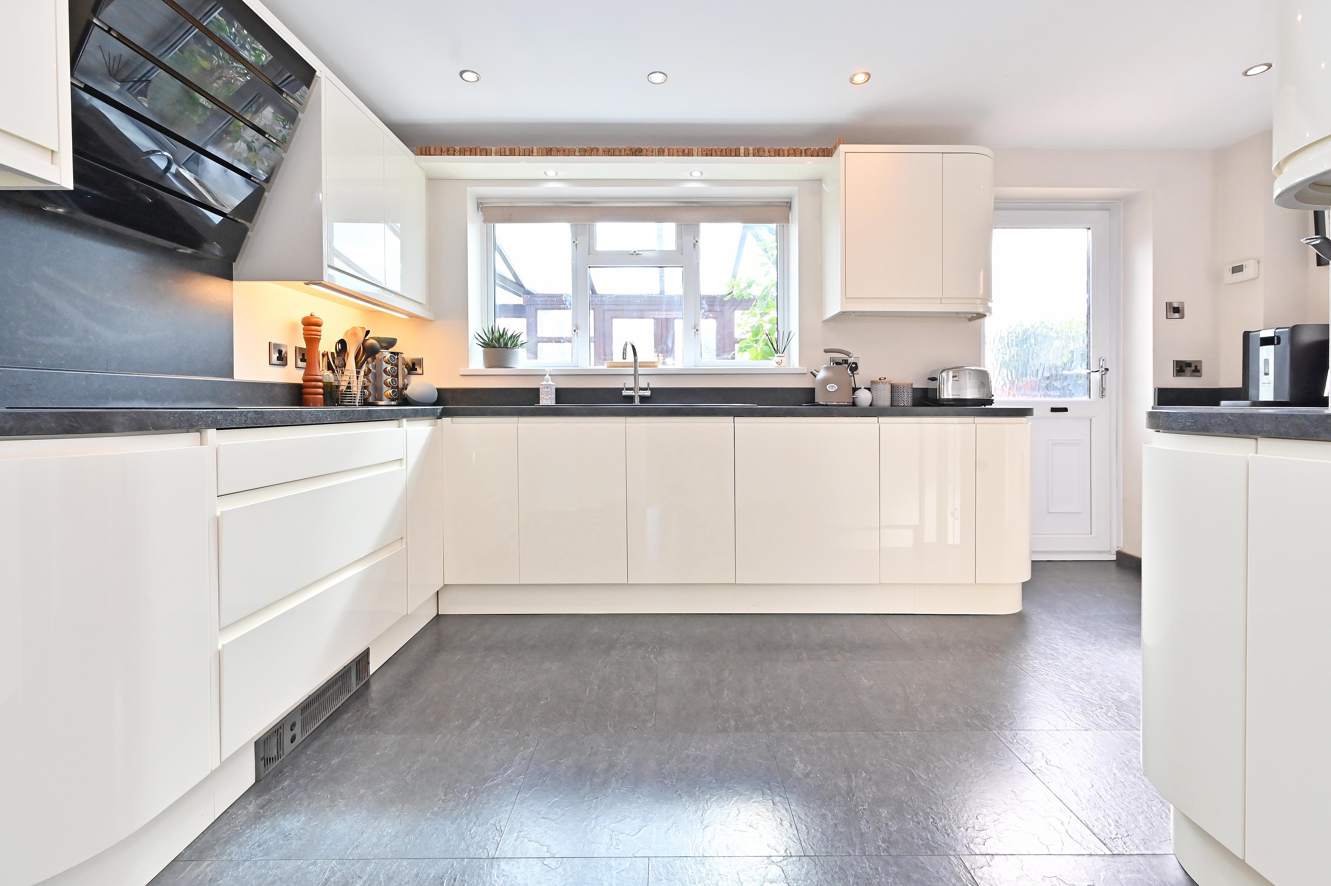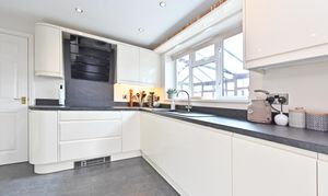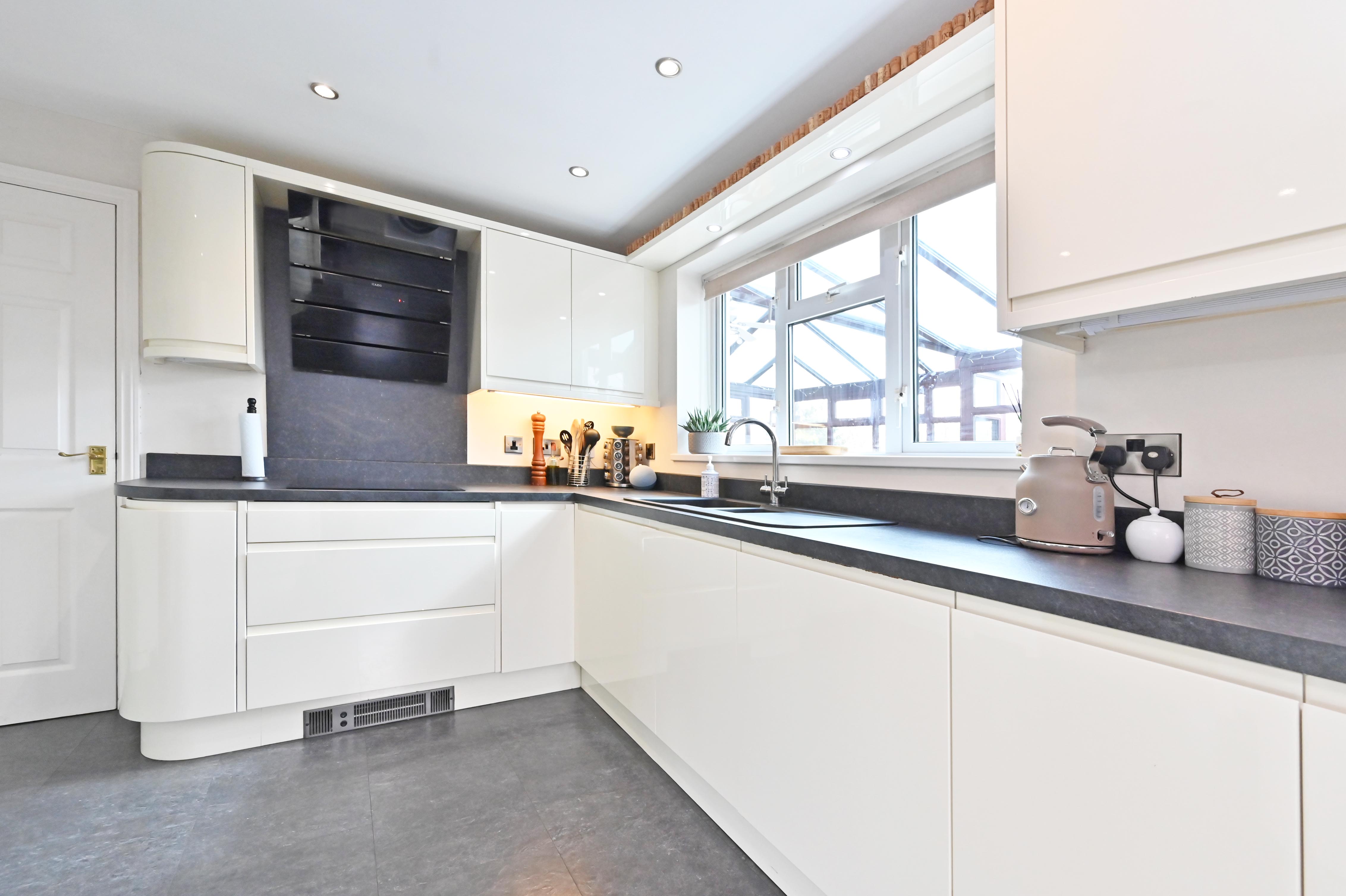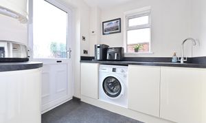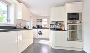 Smartly fitted kitchen with contemporary wall and base units, double glazed to rear and side, inset sink in work surface. Integrated dishwasher, washing machine, microwave and double oven. Four ring induction hob. Stainless sink in utility area, door to cloakroom with WC and wash hand basin.