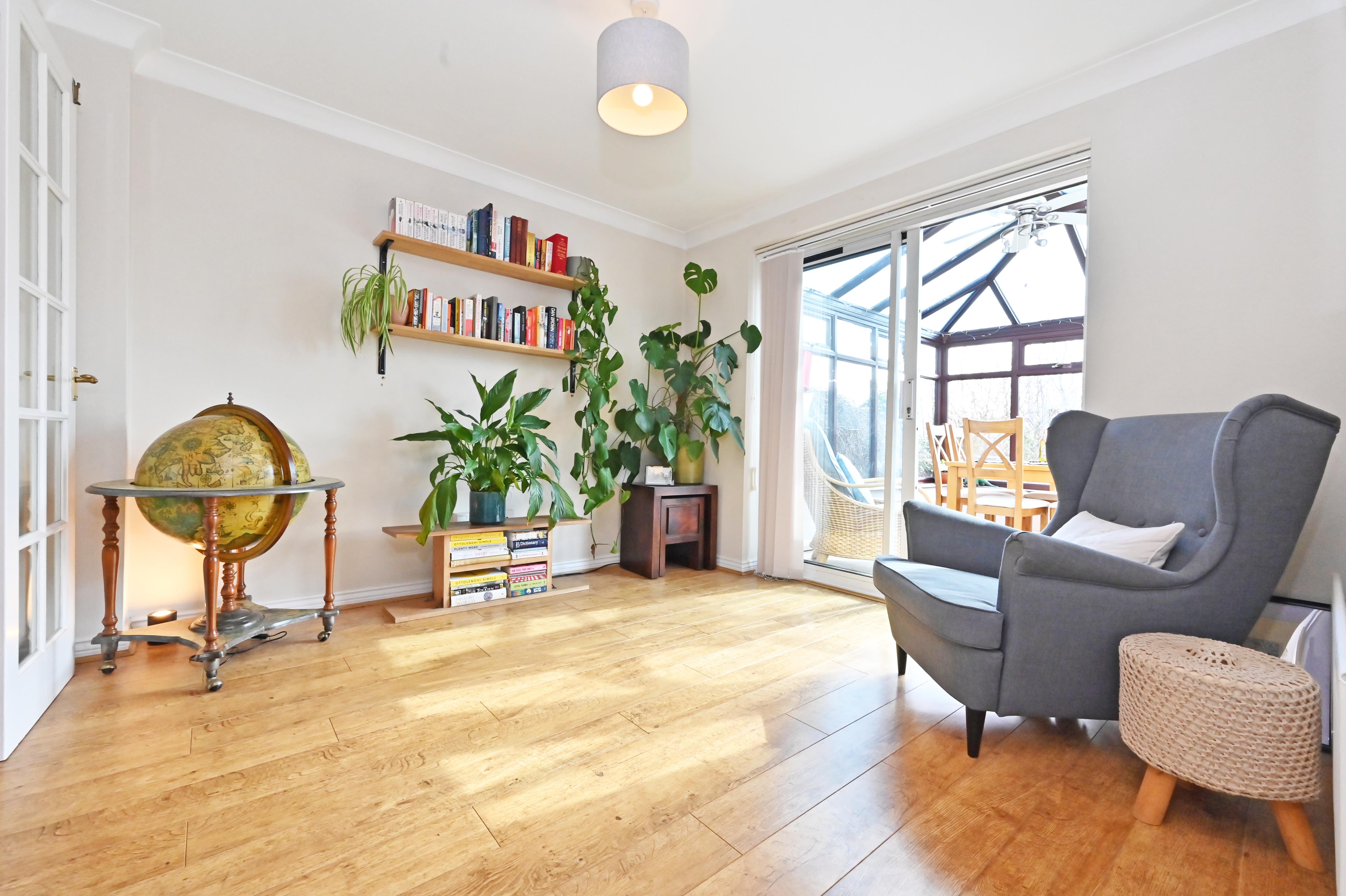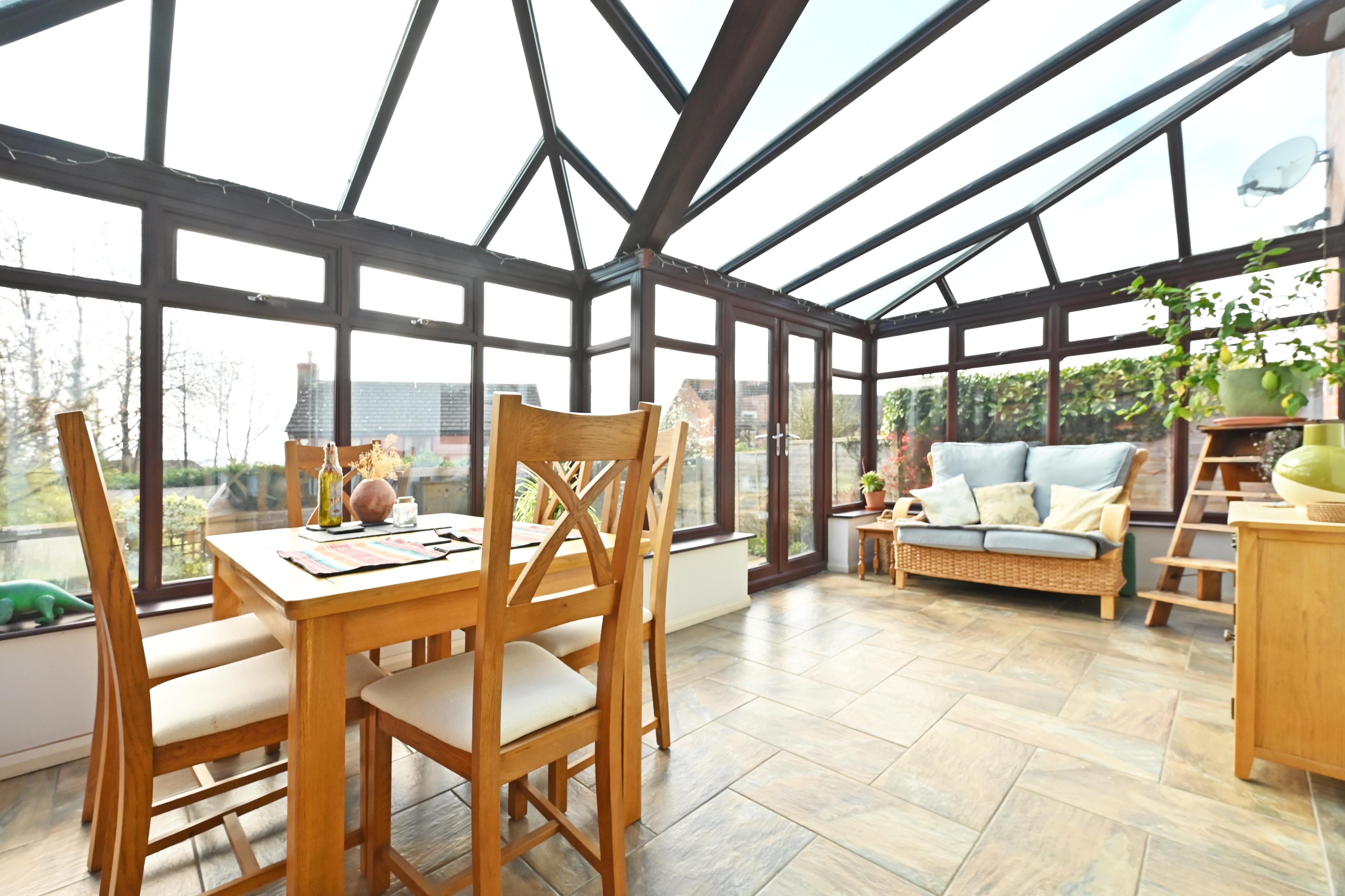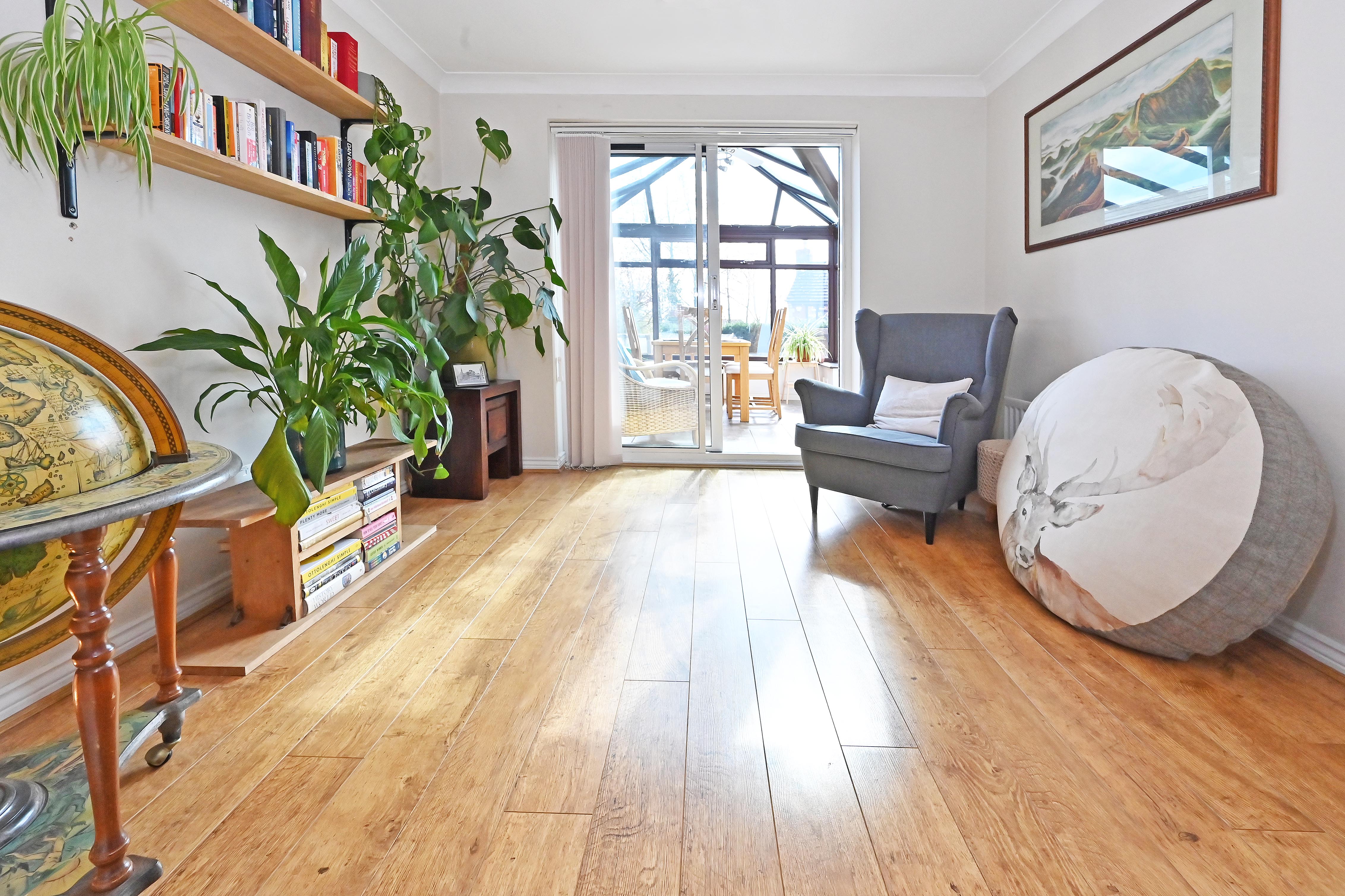 Flooring carried through from sitting room creating a unified space, perfect for entertaining. Patio doors into conservatory