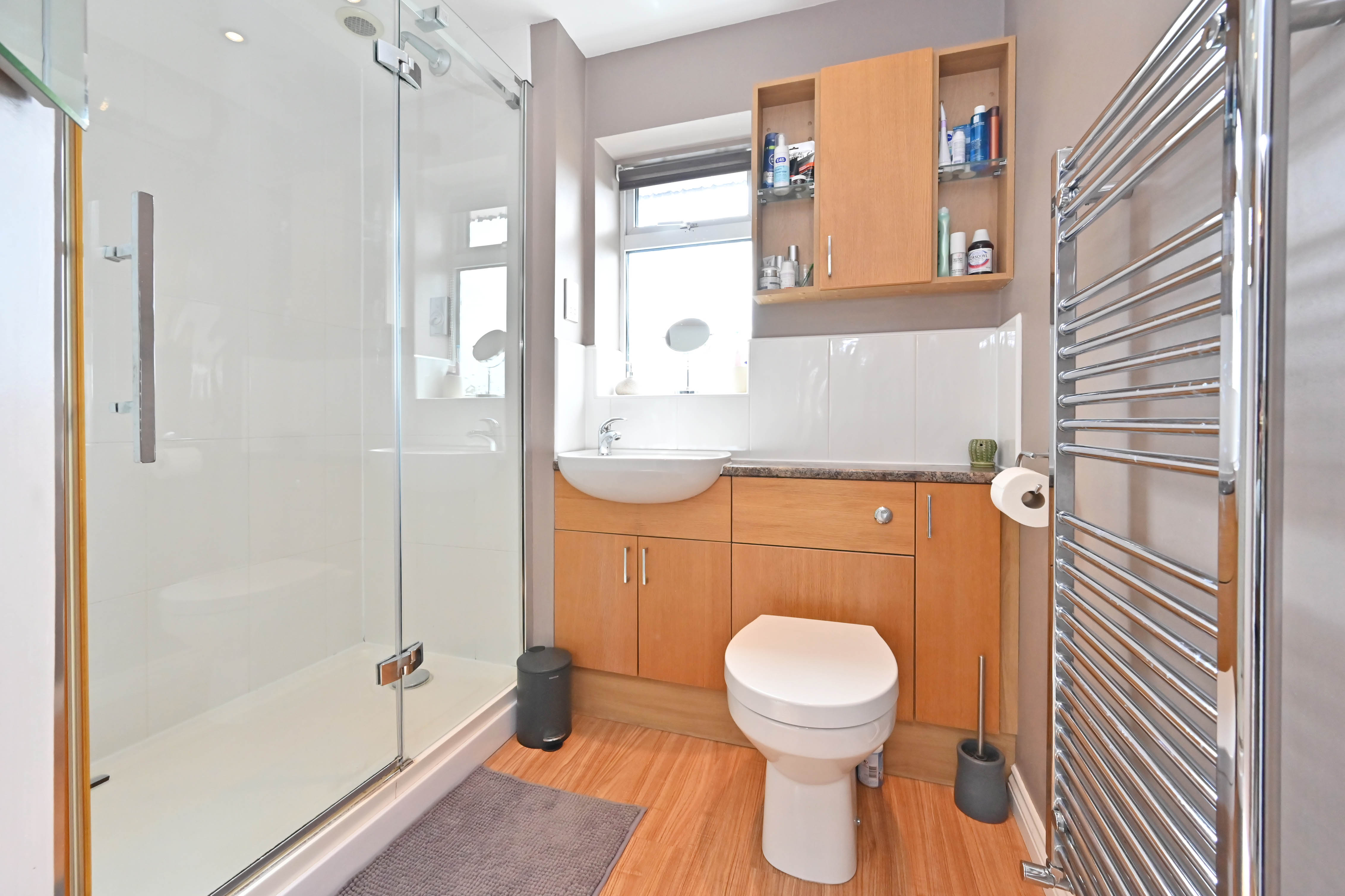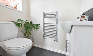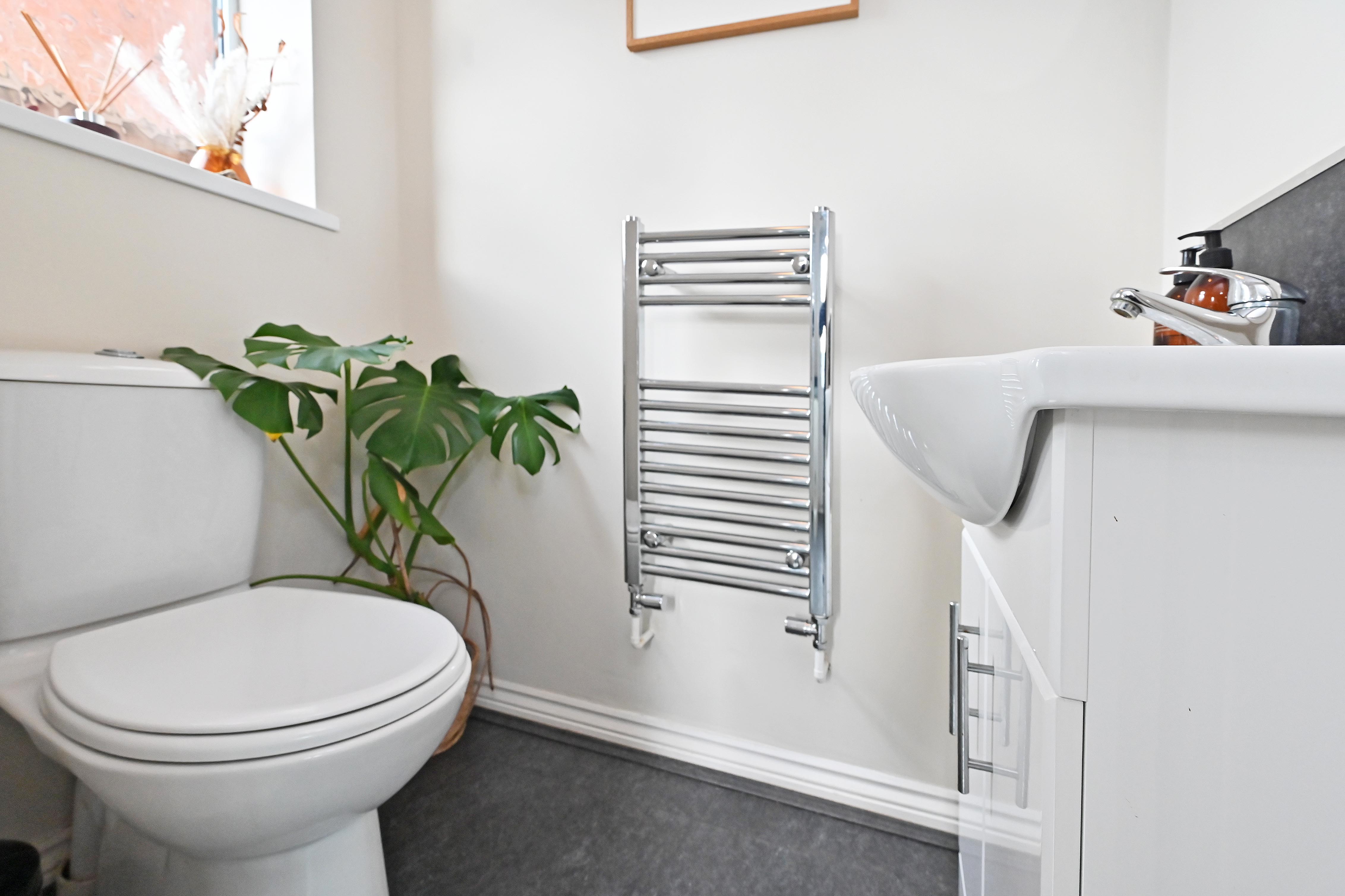 Smartly appointed cloak room off the utility area of the kitchen, white suite comprising WC, wash hand basin and a heated towel rail..