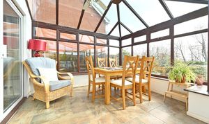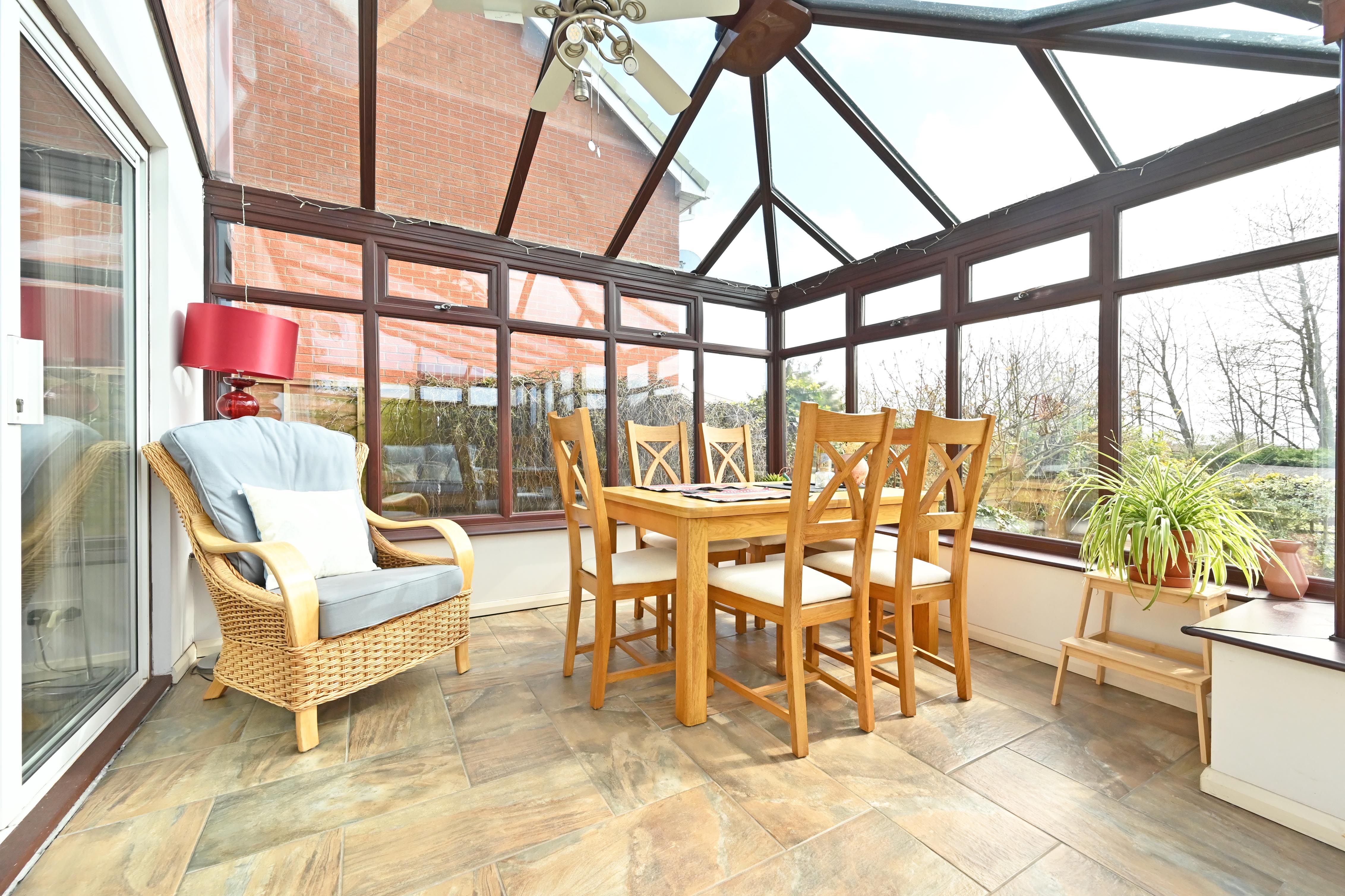 Large conservatory with door out to rear terrace and garden beyond. Ceramic tiled flooring. Ceiling mounted fan integrated into lights. Radiator.