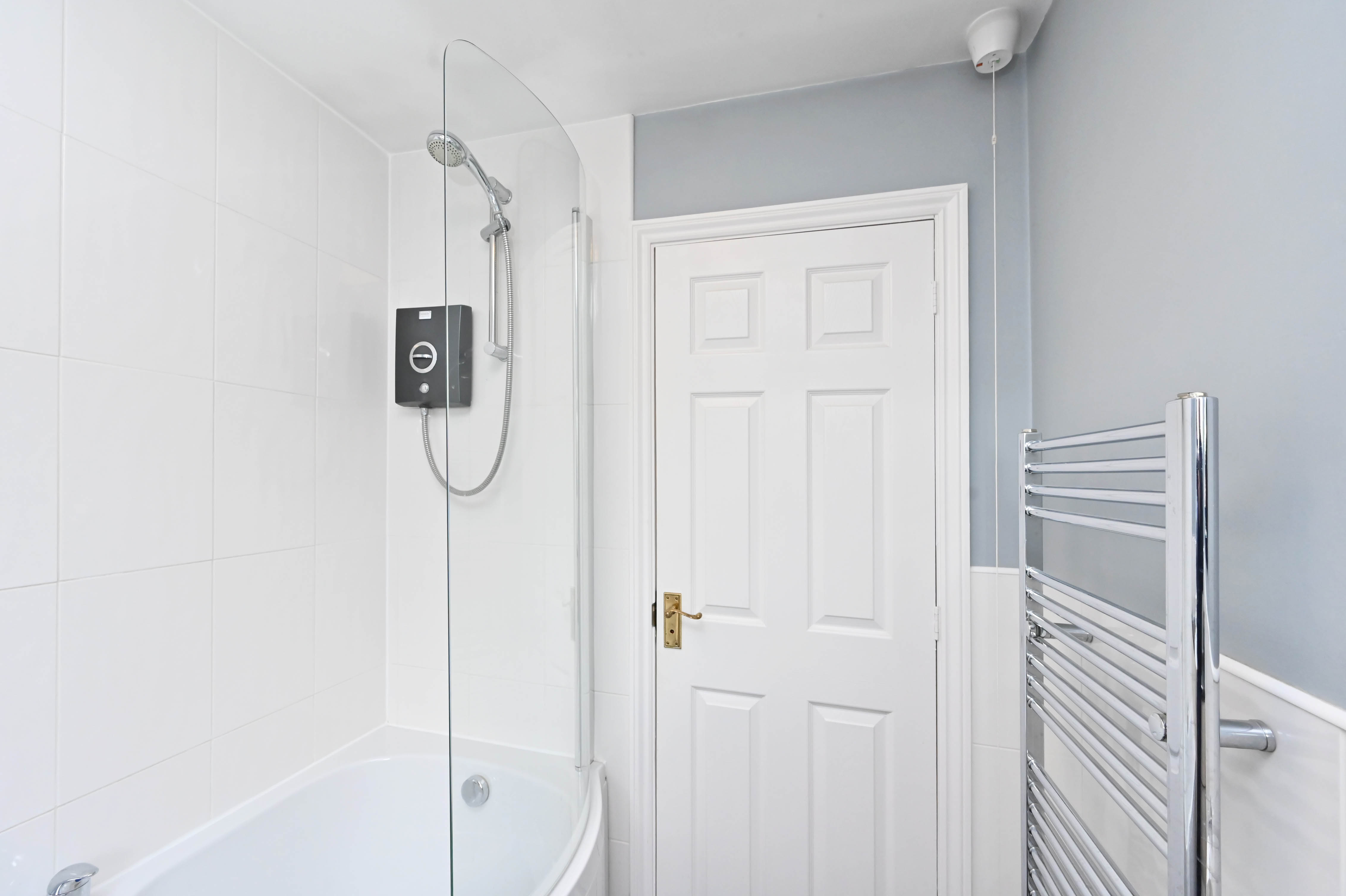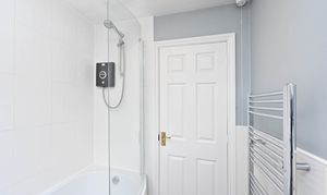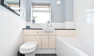 P-shaped bath with shower over, WC, wash hand basin, heated towel rail. Tiled flooring.