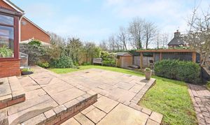 The sitting room opens through to the dining room by double doors, providing space to entertain or with the doors closed, a more intimate and warm space. The dining room in turn opens through to the large conservatory at the rear of the property, with a paved terrace for entertaining, bounded by shaped lawn and mature borders. There is a covered outdoor cooking area to the rear of the garden, perfect for entertaining.