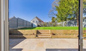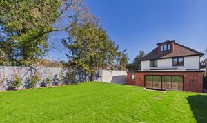 The private rear garden measures approximately 50ft x 45ft with a north westerly orientation offers a large patio area for entertaining with steps up to a lush lawn, with external lighting, garden tap and side access on both sides.
