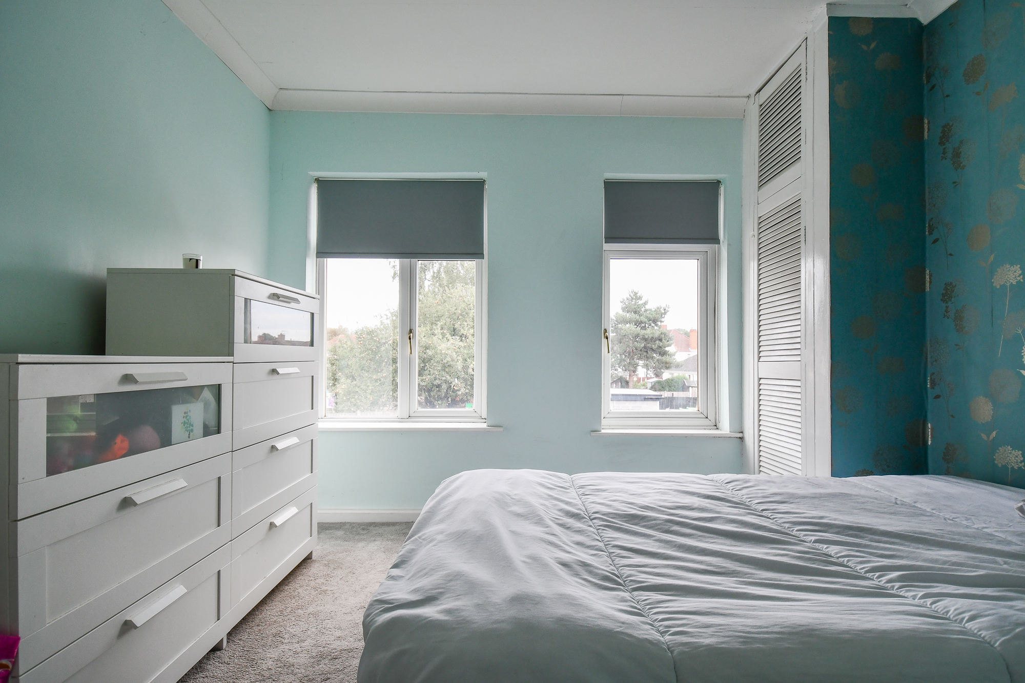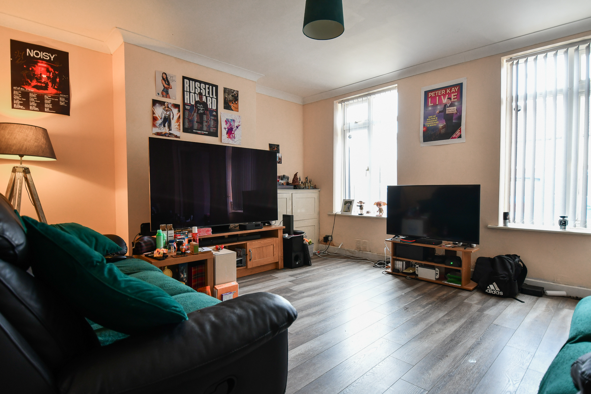The lounge is a spacious and light-filled room with two large windows, neutral décor, and wood-effect laminate flooring. It’s a practical and versatile space, ready for someone to make it their own.