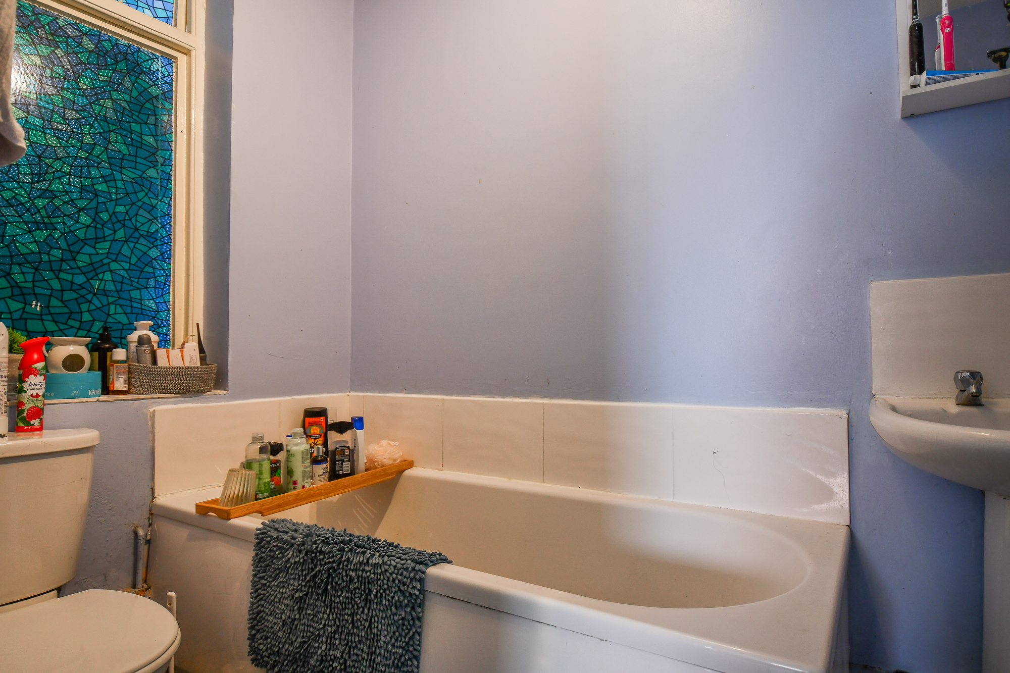 The bathroom is located on the ground floor and features a panelled bath with tiled splashback, a pedestal sink, and toilet.