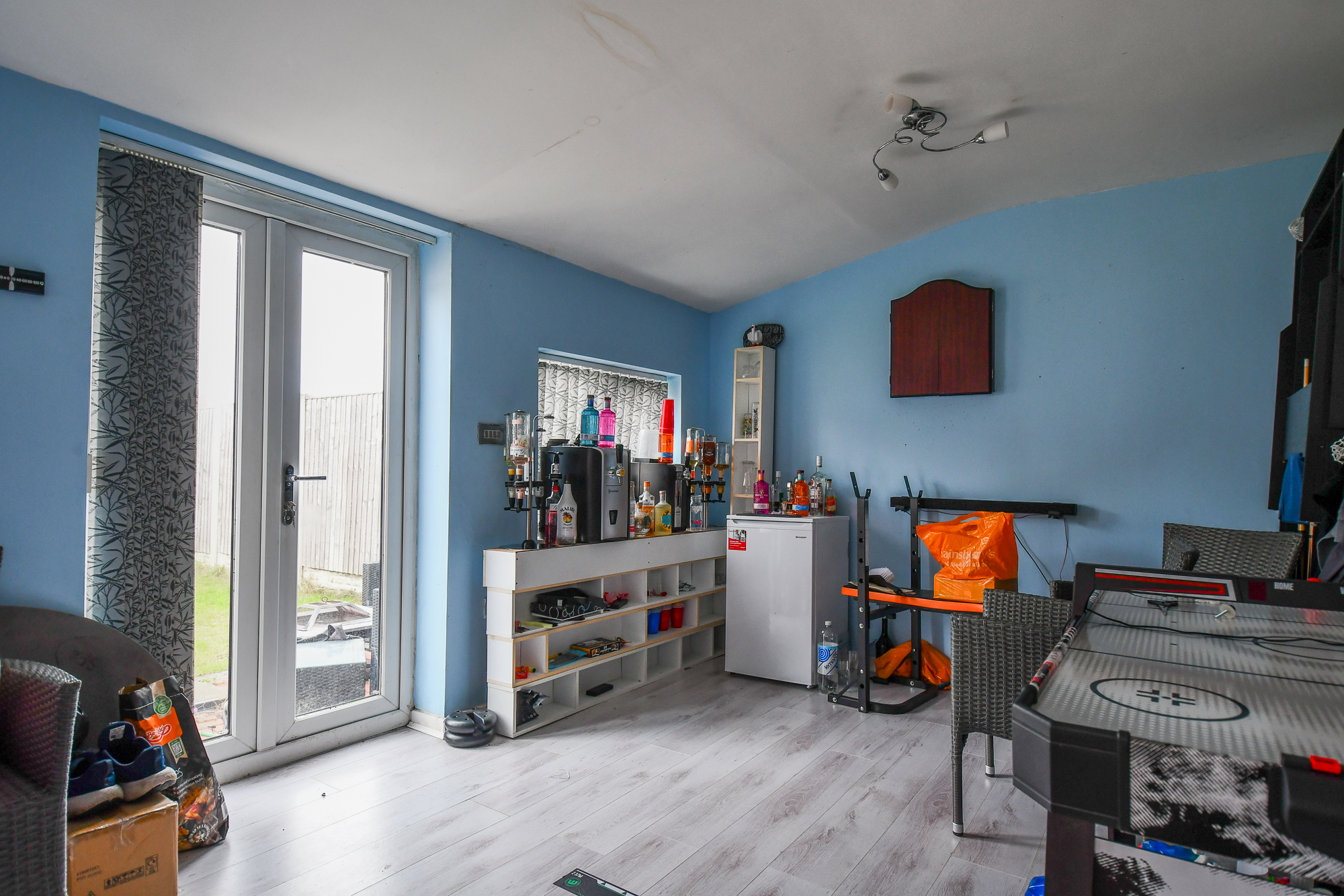 The dining room is located at the rear of the property and benefits from French doors that open out to the garden, allowing in plenty of natural light. The space is laid with wood-effect laminate flooring and has a sloped ceiling with spotlight-style lighting. Ideal for dining or as a multi-use space.