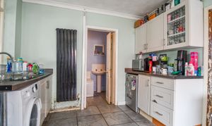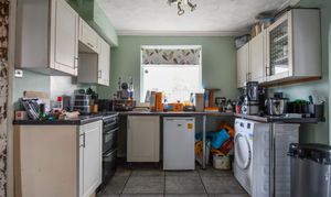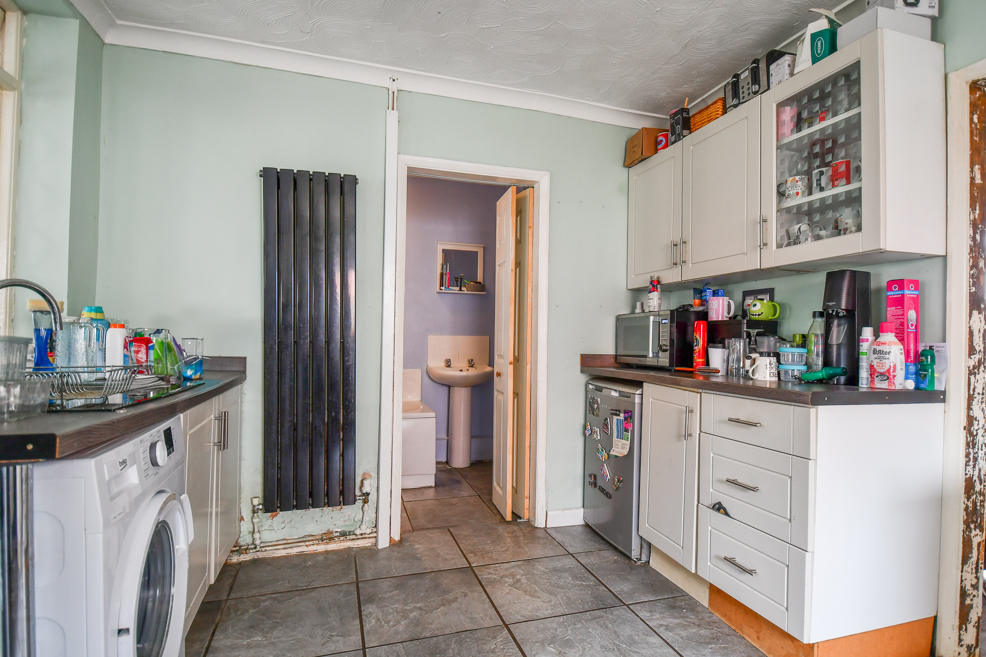 The kitchen is a good size, with a range of fitted wall and base units, space for appliances, and a tiled floor. There's a window overlooking the driveway and a tall black radiator to one wall. The layout includes access to the downstairs bathroom.