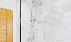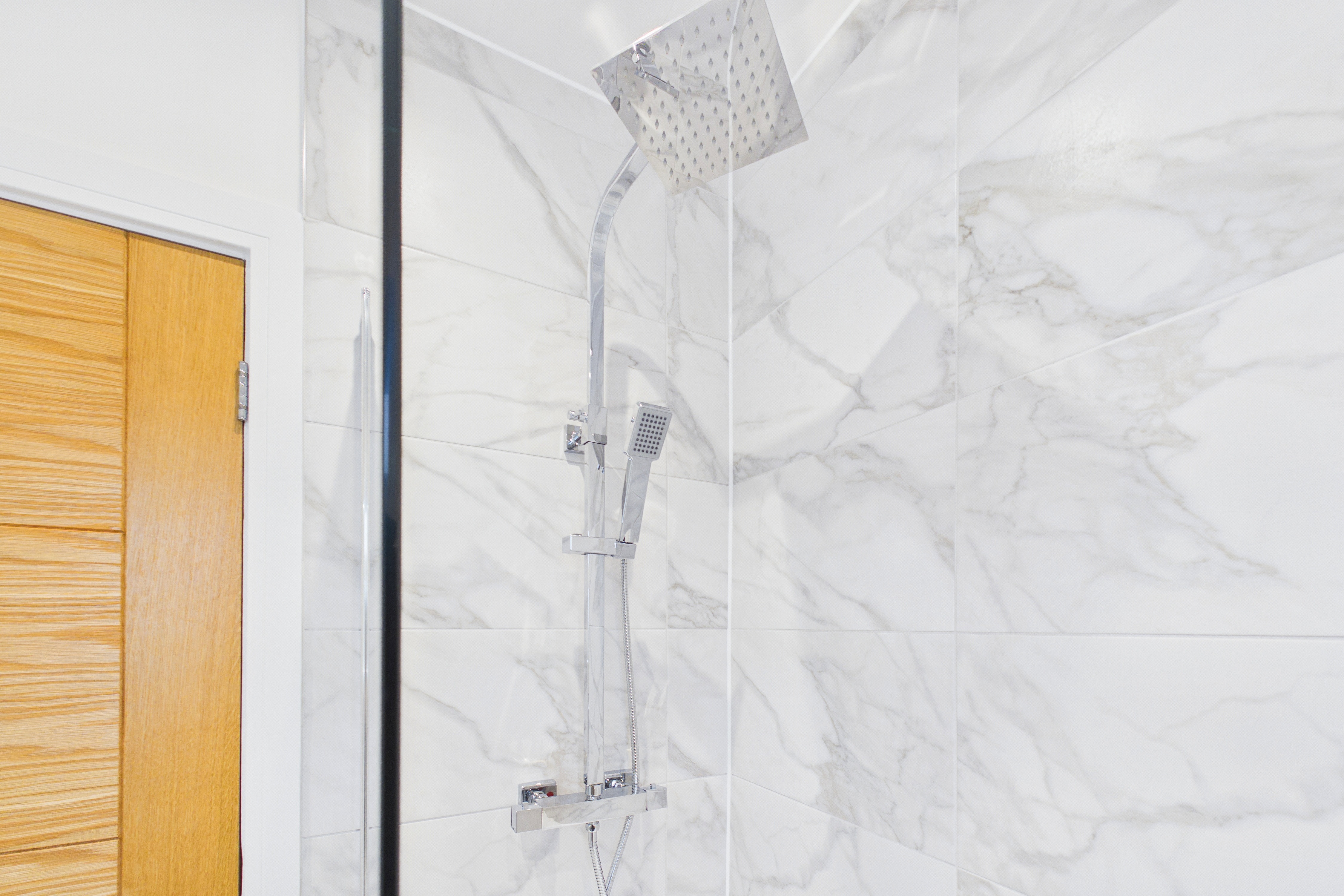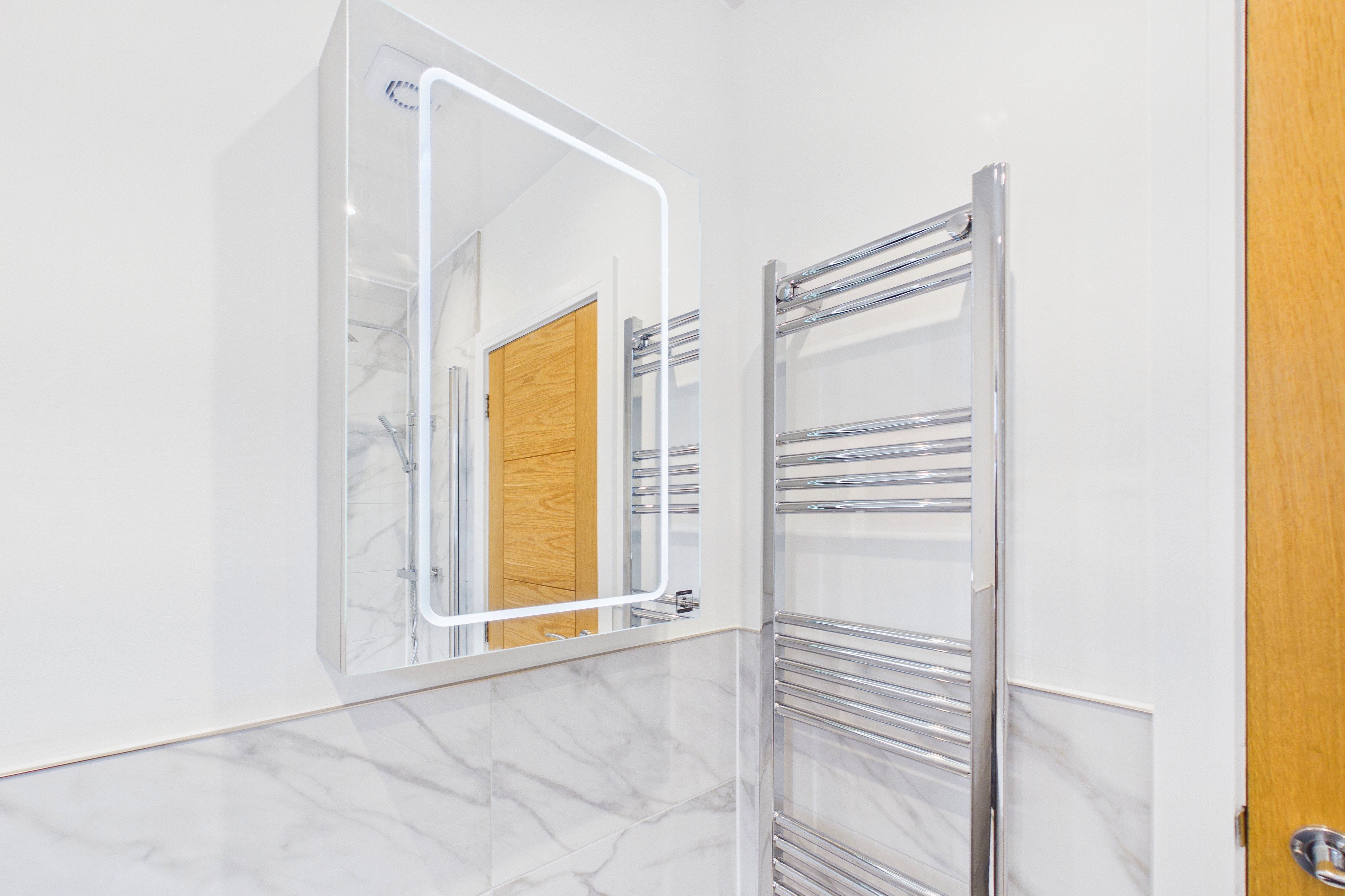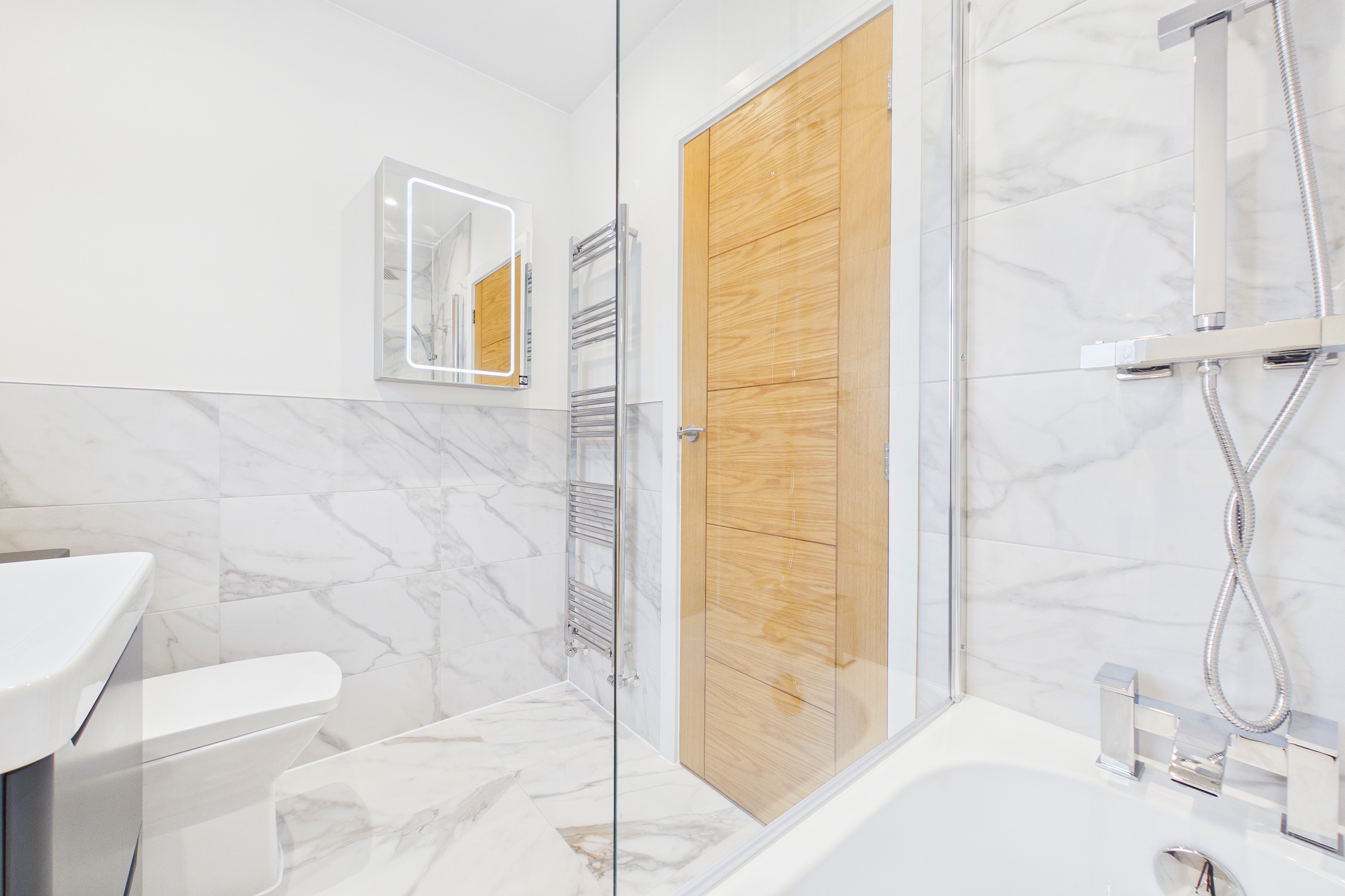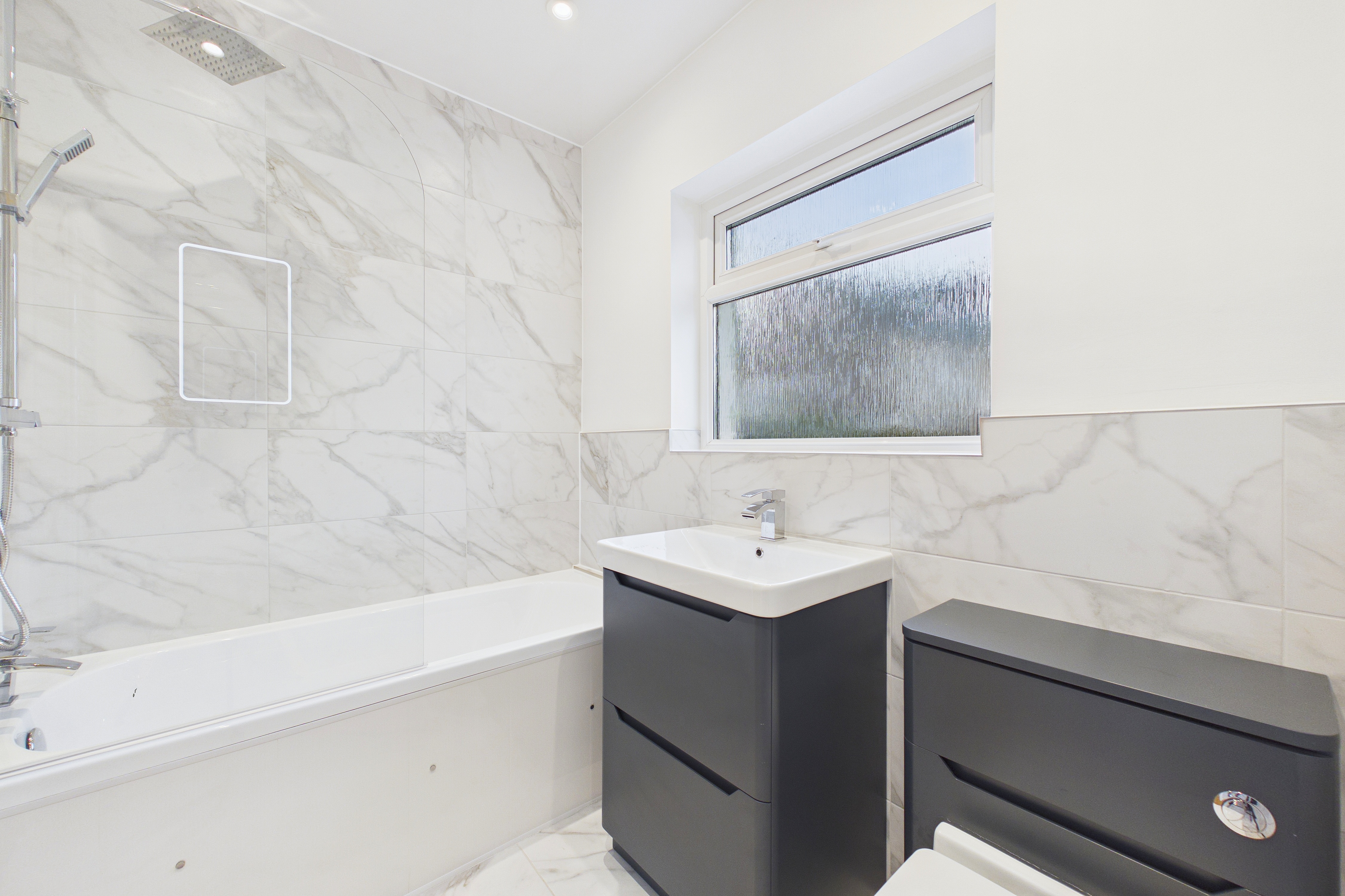 - Eye-catching bathroom suite with a rainfall and handheld shower head. Stylish vanity with drawers and a mirrored cabinet with integrated lighting