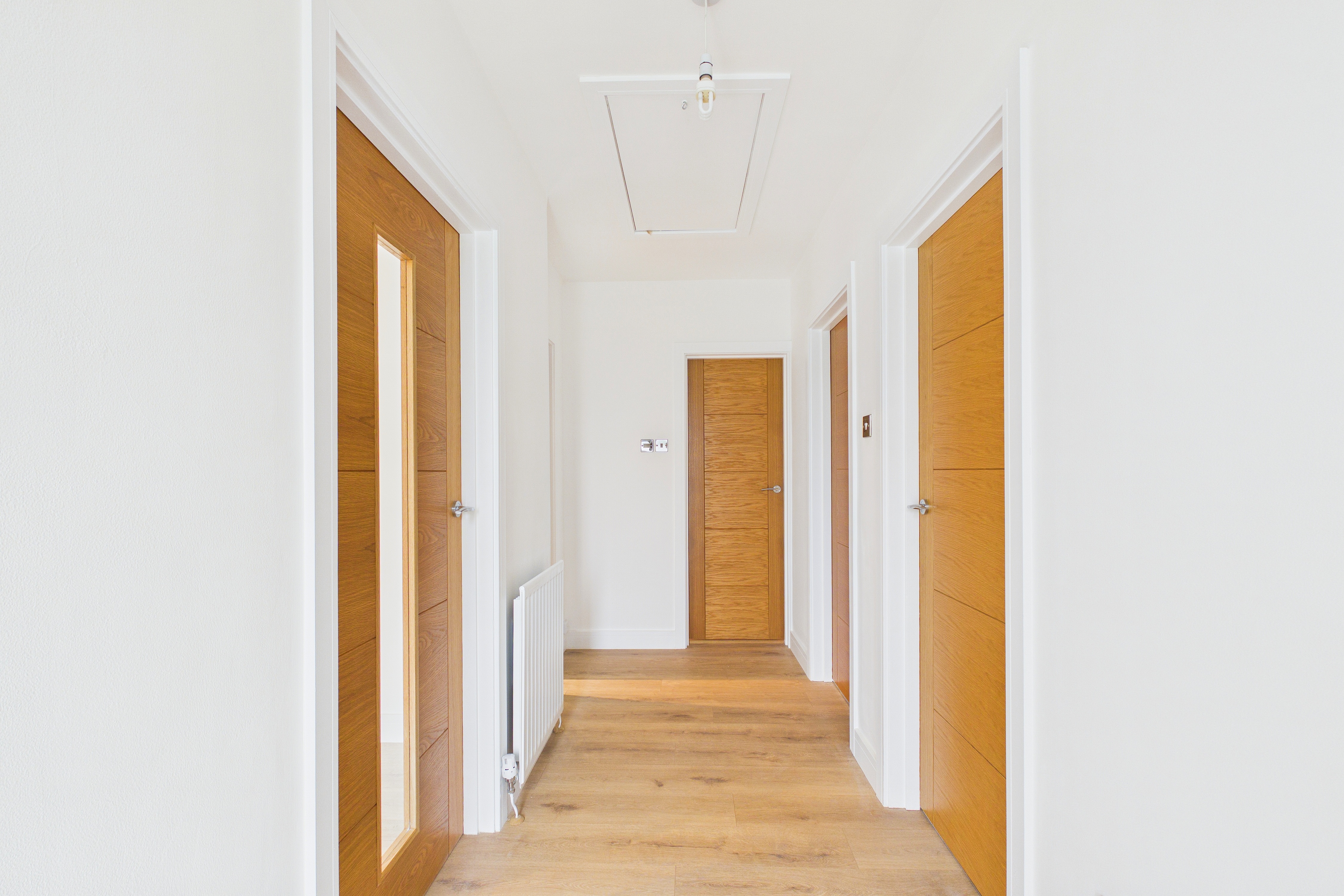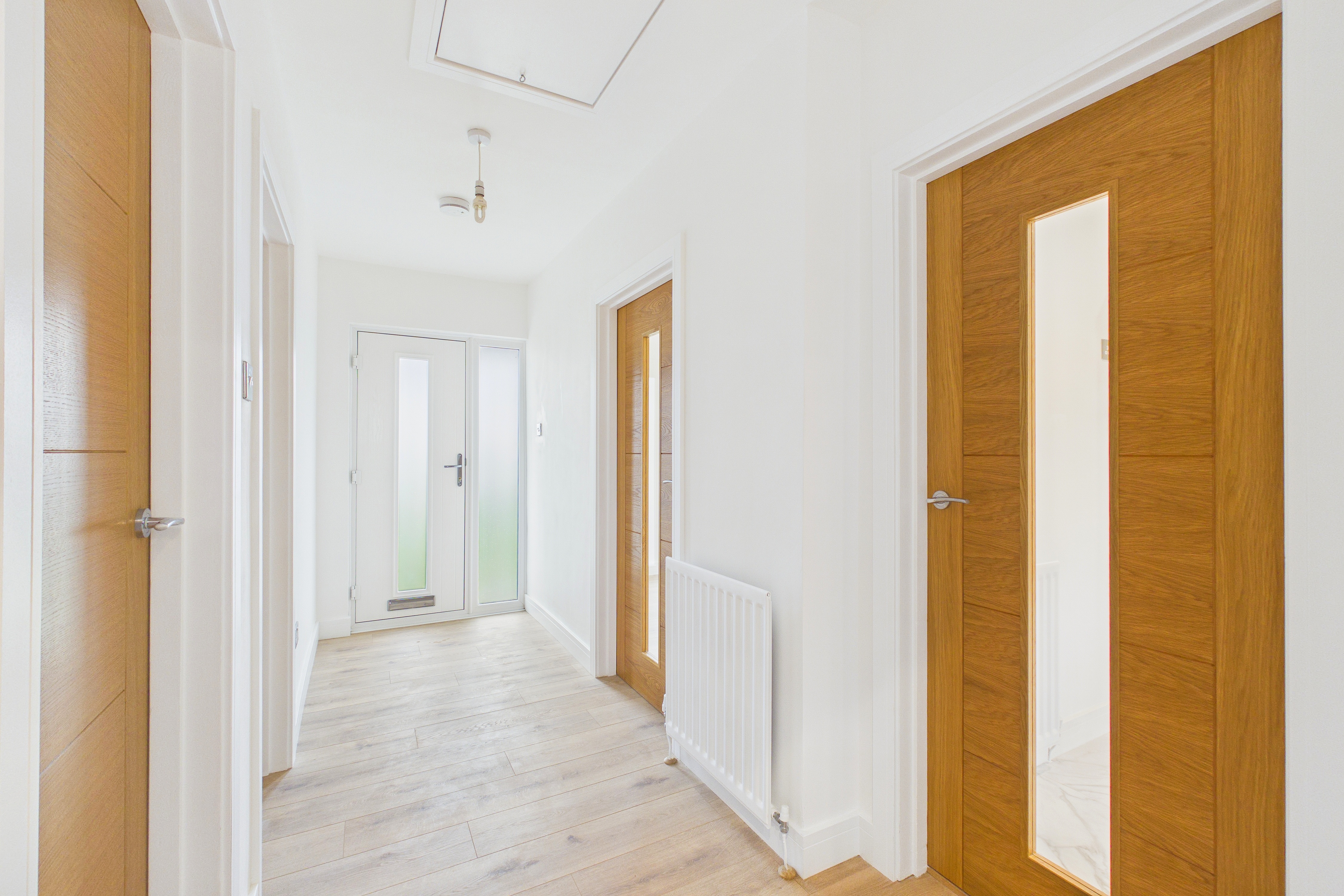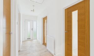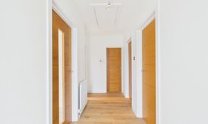 As you enter through the welcoming hallway, you are greeted by stylish oak veneer doors that lead to the lounge, kitchen, both double bedrooms, and the beautifully appointed bathroom. The hallway also features a newly installed loft hatch, revealing a vast loft space that offers an abundance of storage possibilities, perfect for keeping your living areas clutter-free.