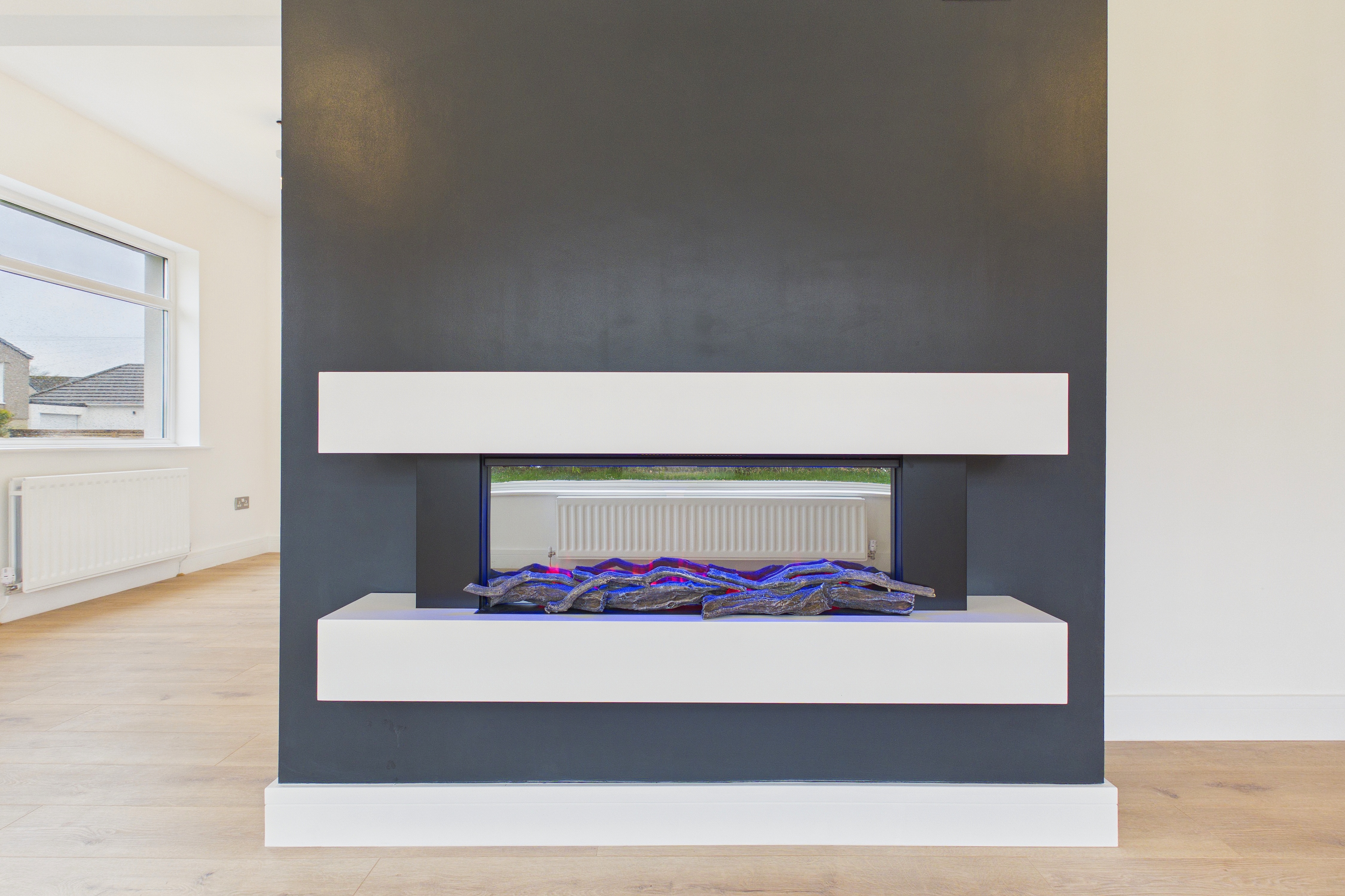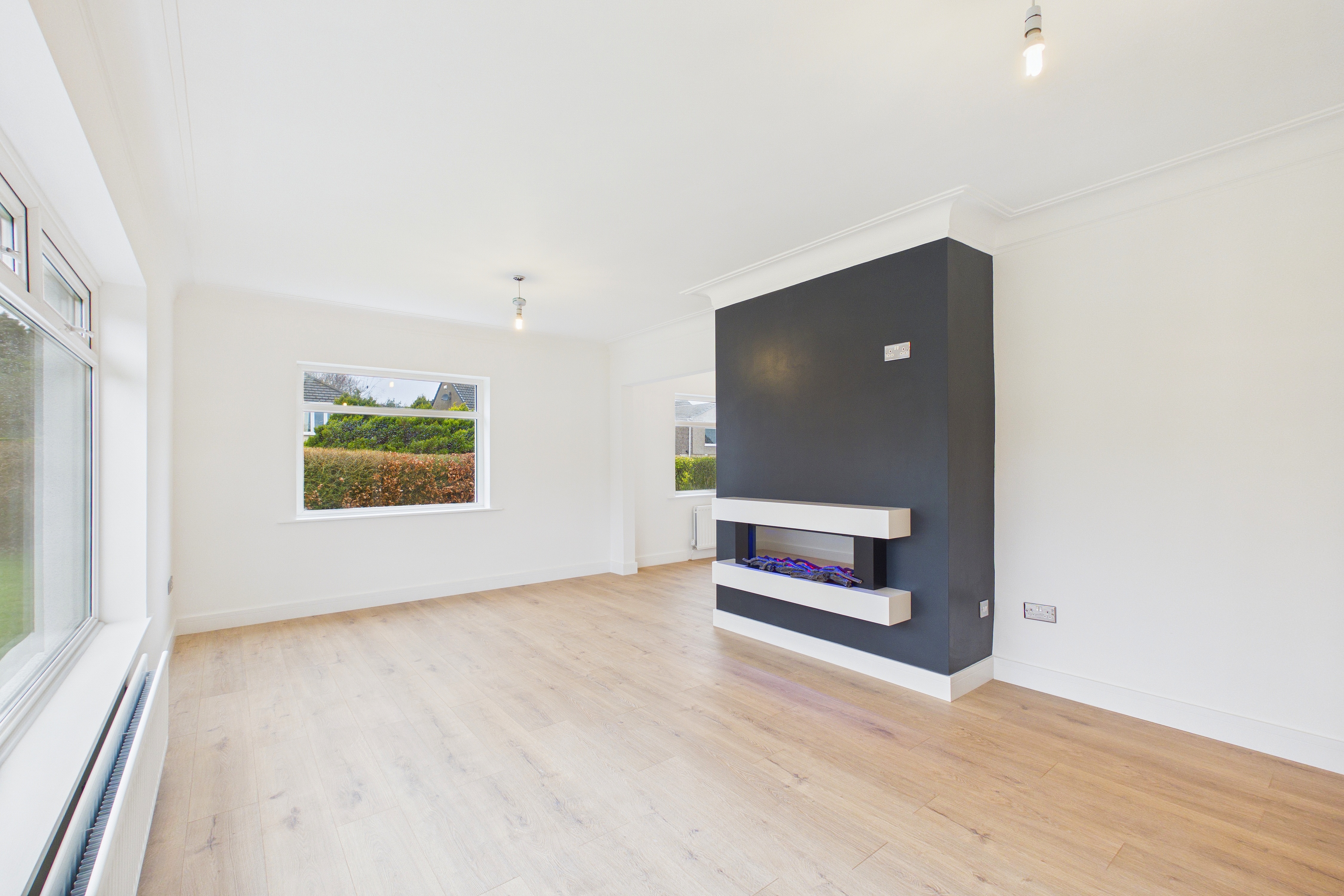 - A bright, spacious lounge with lots of light, eye-catching remote control fireplace, opens up to the dining area