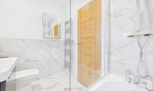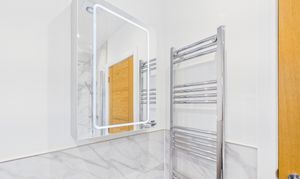 Both bedrooms are generously proportioned doubles, each benefiting from dual aspect windows that flood the rooms with light and offer pleasant views, making them perfect retreats for rest and relaxation. The bathroom is a sanctuary of style and function, featuring a luxurious rainfall and handheld shower head, a sleek vanity with drawers, and a mirrored cabinet with integrated lighting. Stylish tiles and a chrome heated towel rail add the finishing touches to this elegant space.