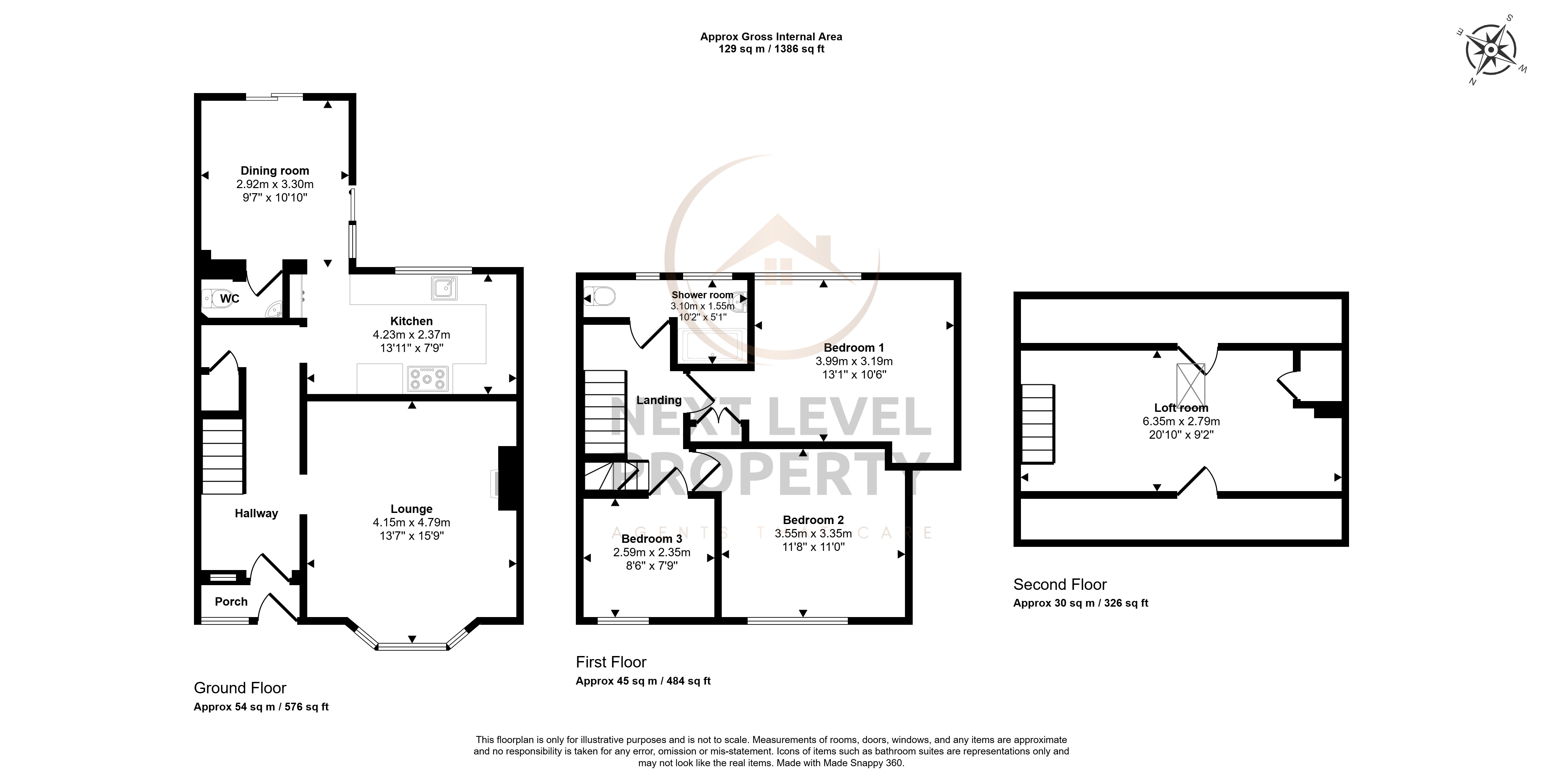 The landing provides access to the bedrooms and shower room, with a narrow staircase leading up to the loft room.