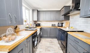 The kitchen features a recently upgraded, stylish modern grey design with Shaker-style doors and drawers. It includes a solid wood butcher’s block work surface, a classic butler sink, and space for a range cooker. There are matching wall cupboards, a cooker hood, tiled splashbacks, and a tiled floor. A UPVC double-glazed window overlooks the rear, and a door leads through to the dining room.