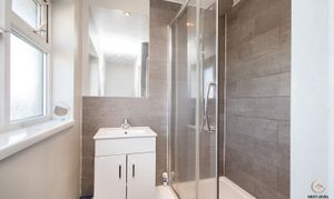 The shower room includes a large shower cubicle, a WC, and a hand basin set within a vanity storage unit. There are tiled splashbacks and a UPVC double-glazed window to the rear.