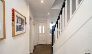 Welcoming hallway with stairs rising to the first floor, useful understairs storage, and doors opening to both the lounge and kitchen.