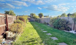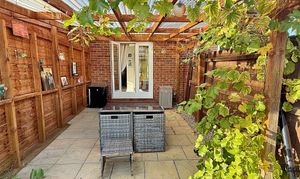 The rear garden features an enclosed paved area, ideal for keeping pets secure, along with a charming covered seating space adorned with an established grapevine and a clear roof, perfect for relaxing outdoors. Beyond this, there is an extensive lawn bordered by well-stocked flower beds, creating an attractive and versatile outdoor space.