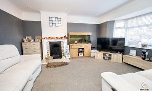 Spacious lounge featuring a charming fireplace with an open fire and a UPVC bay window to the front, allowing plenty of natural light.