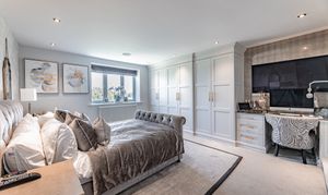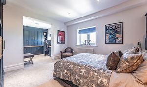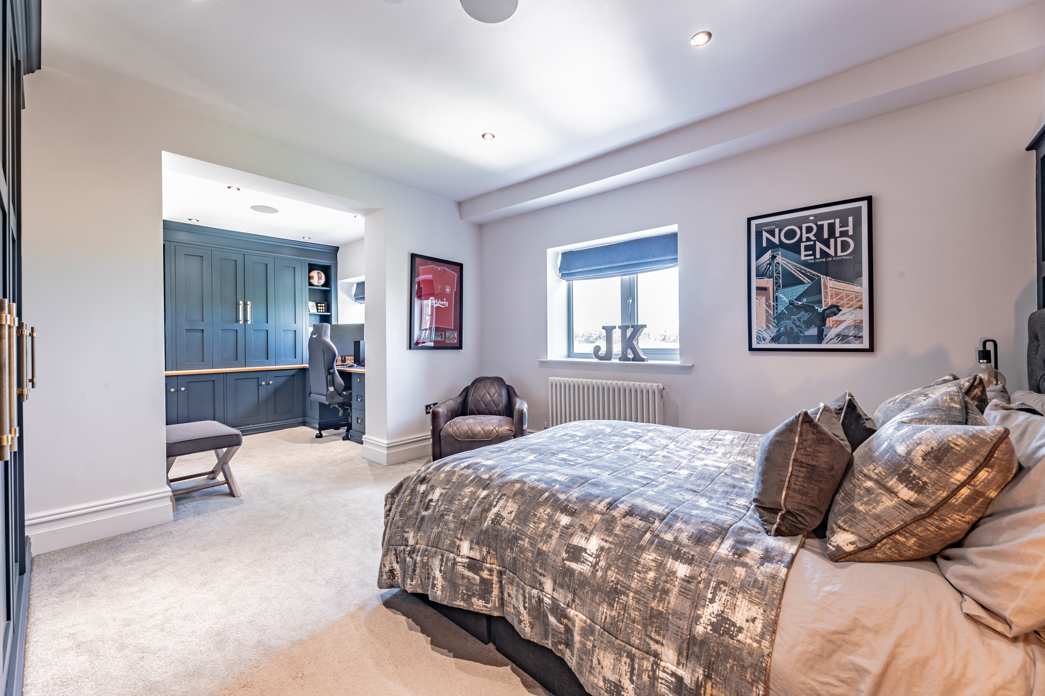 On the left, the fitted dressing room overflows with storage and offers an enchanting outlook out over the fields and countryside. On the right, enter the private study, where fitted furniture is topped in solid wood worktops for a stylish finish. There is also a media wall with television.