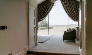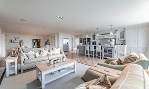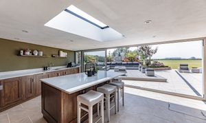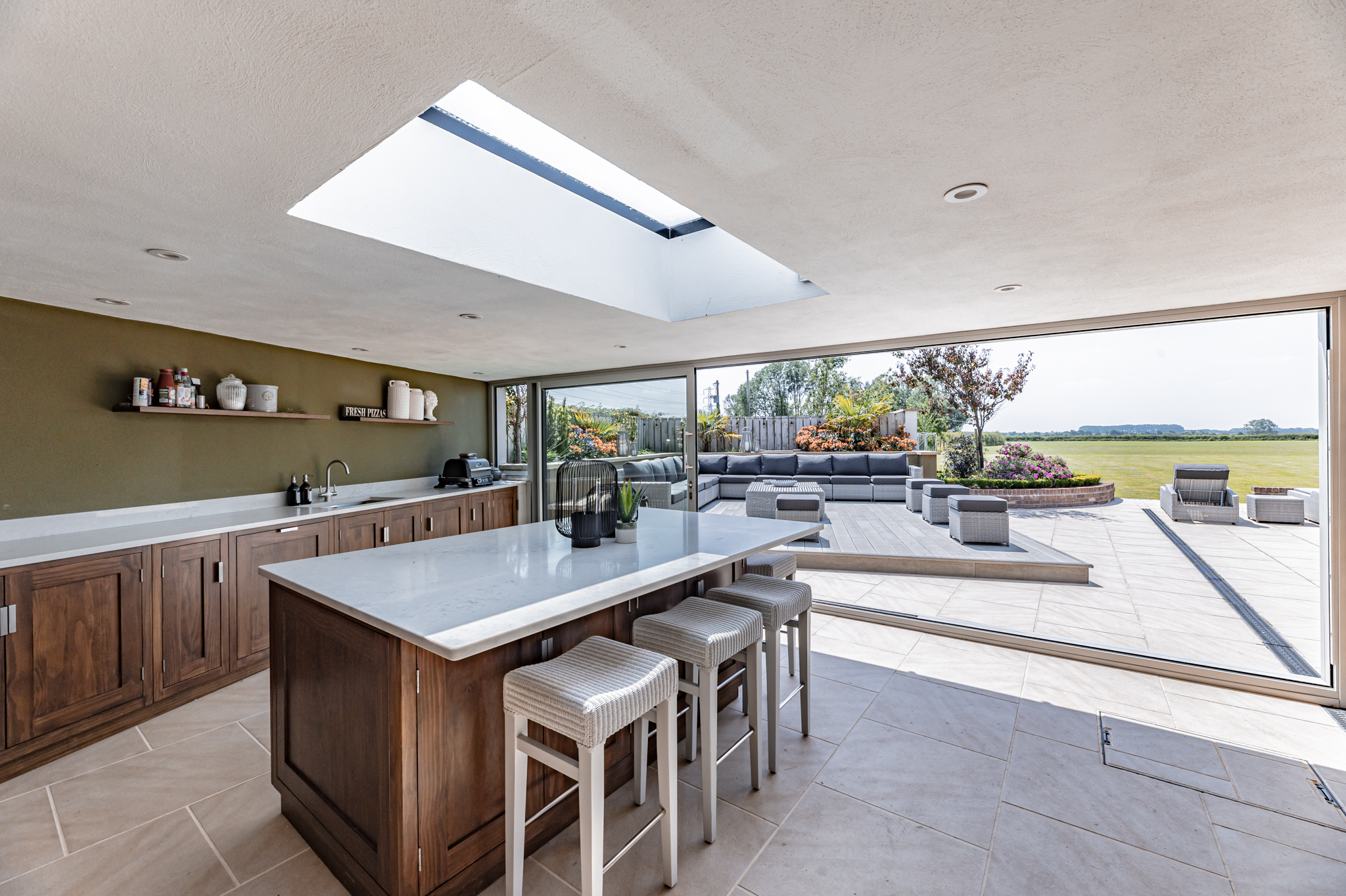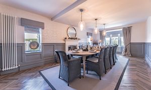 Sociably open, yet conscientiously zoned to allow family to ebb and flow, congregating together and seeking out pockets of privacy and solitude. The cream Chesney wood-burning stove serves as a cosy focal point, bringing loved ones together, whilst the vast glass sliding doors ensure the outdoors is never far away.