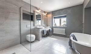 Wave feature tiling is a focal point behind the roll top, claw foot bath, filled by a wall-mounted tap. To the side, the handy laundry chute makes light work of the washing. Step into the wet-room, walk-in shower, with drench head. Fully tiled to the walls and floor, an inset television features alongside two elegant wash basins and wall-mounted WC. Fitted storage is available for all your lotions and potions.