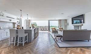 A vision of open plan living, the entrance hall opens up to the airy and light-filled kitchen-dining family space, the heart of the home. Immediately, on the right, sliding glass doors draw the outdoors in, framing far reaching views out over the decked terrace to the acres of garden stretching into the distance.