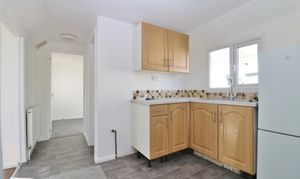 The kitchen has been fitted with a range of wall and base units with a stainless steel sink, and appliance space for a fridge/freezer and washing machine. There is a window to the side and a large opening leading through to the triple aspect lounge, which has French doors onto the balcony.