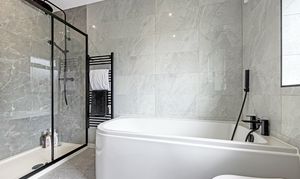 The contemporary bath and shower room showcases high quality fixtures and a stylish finish, complementing the overall modern aesthetic.