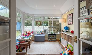 A thoughtfully designed summer/play room provides flexible space for relaxation or children's activities.