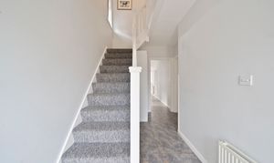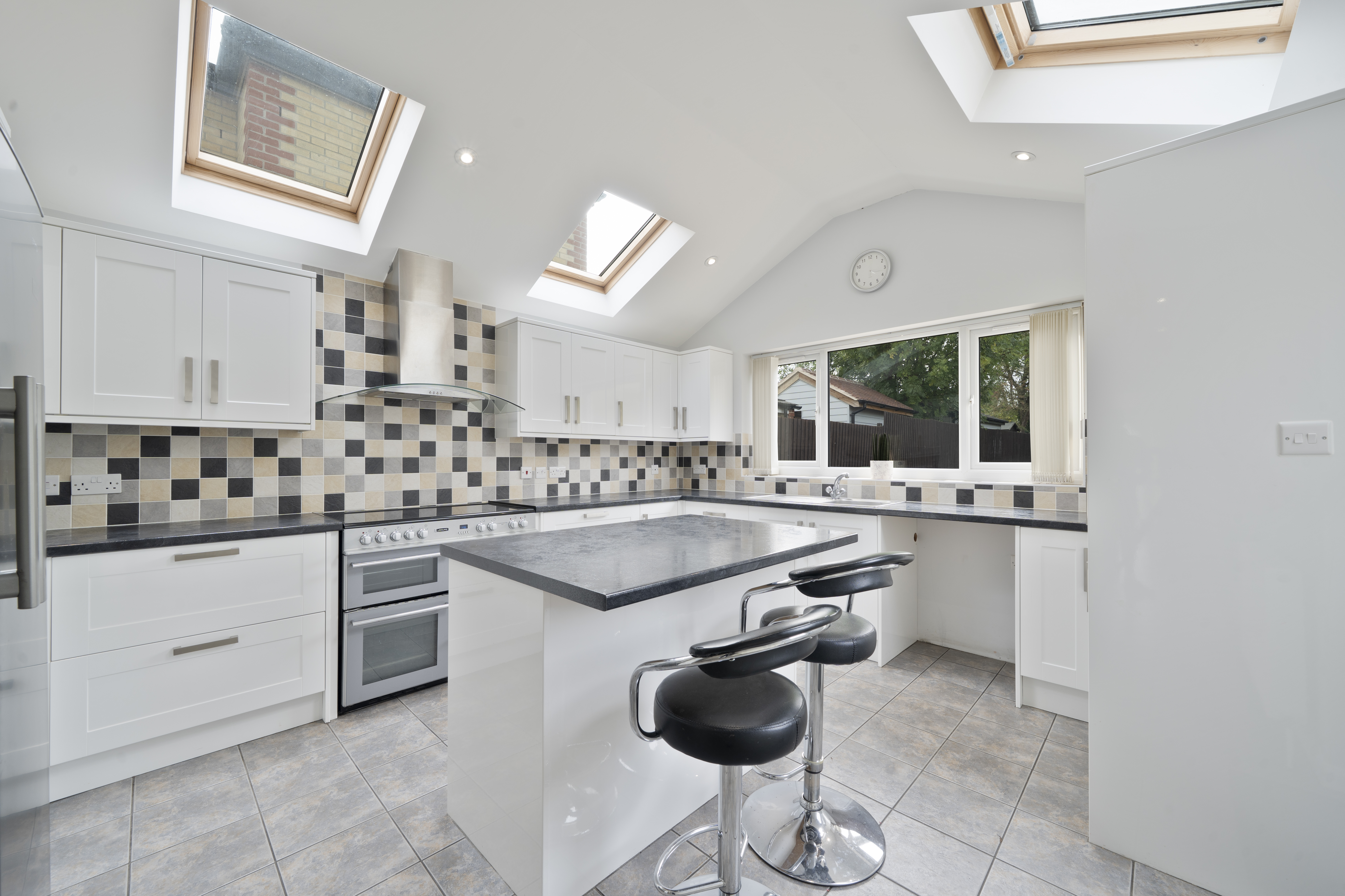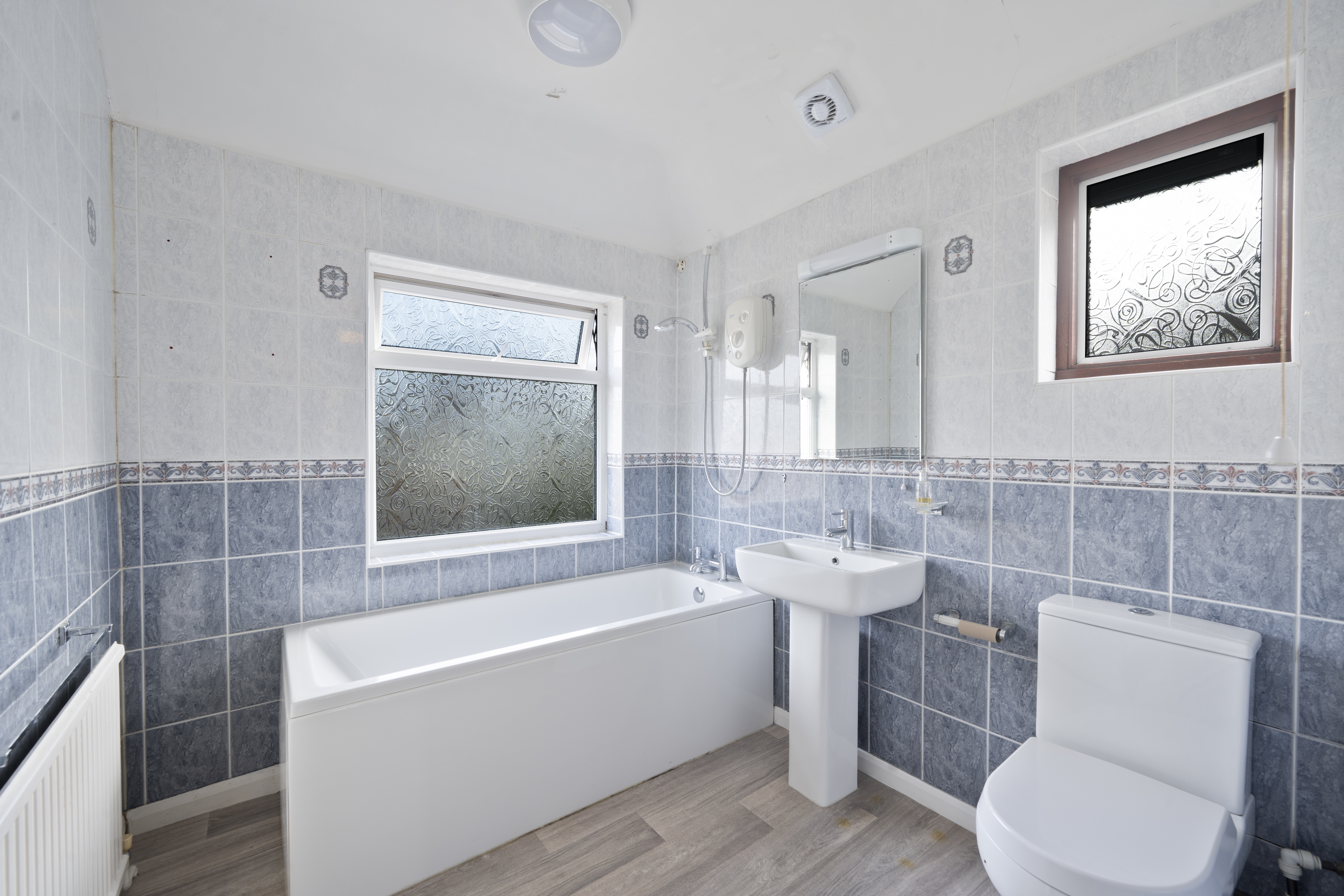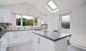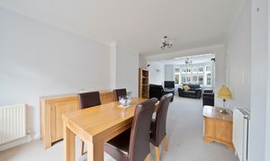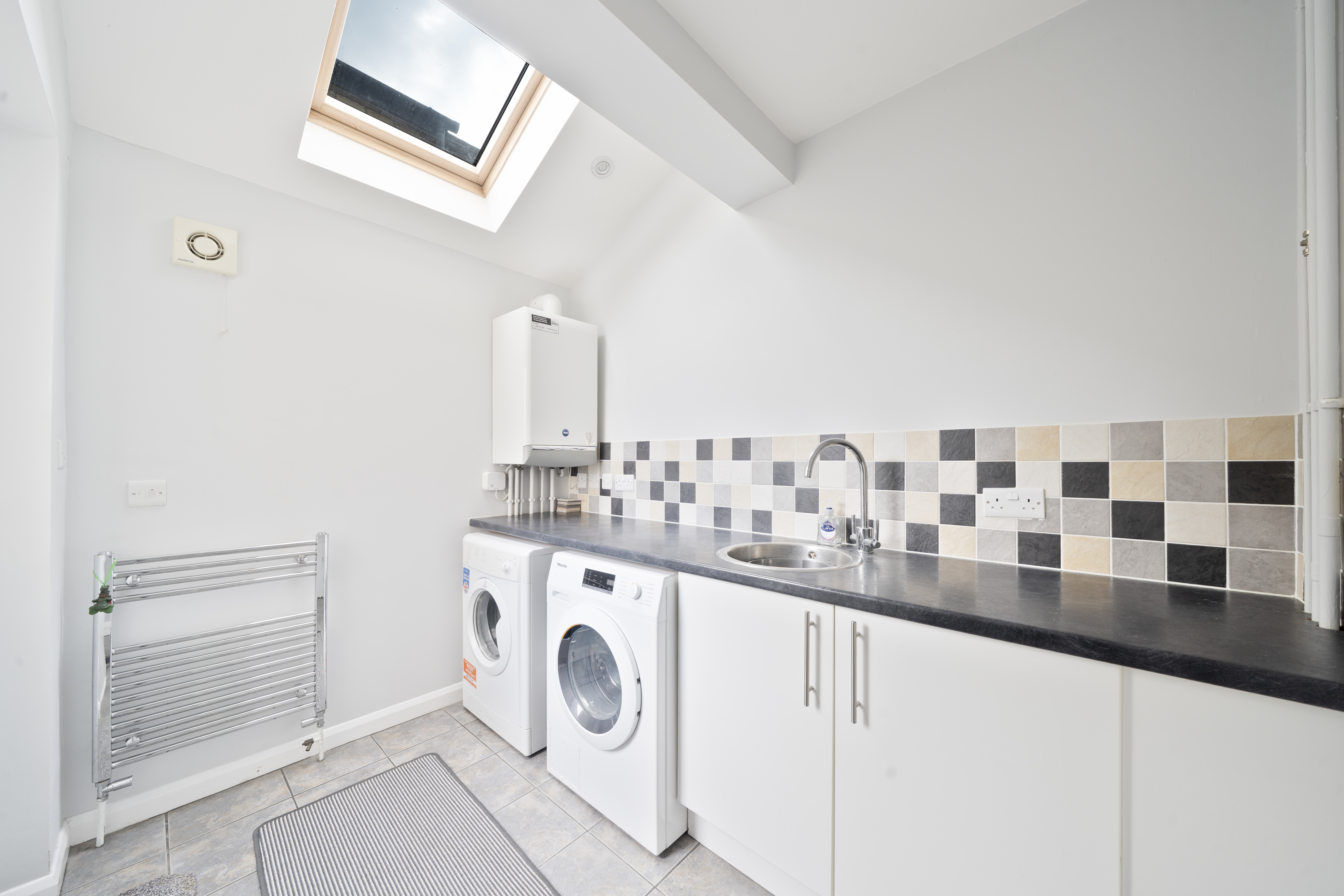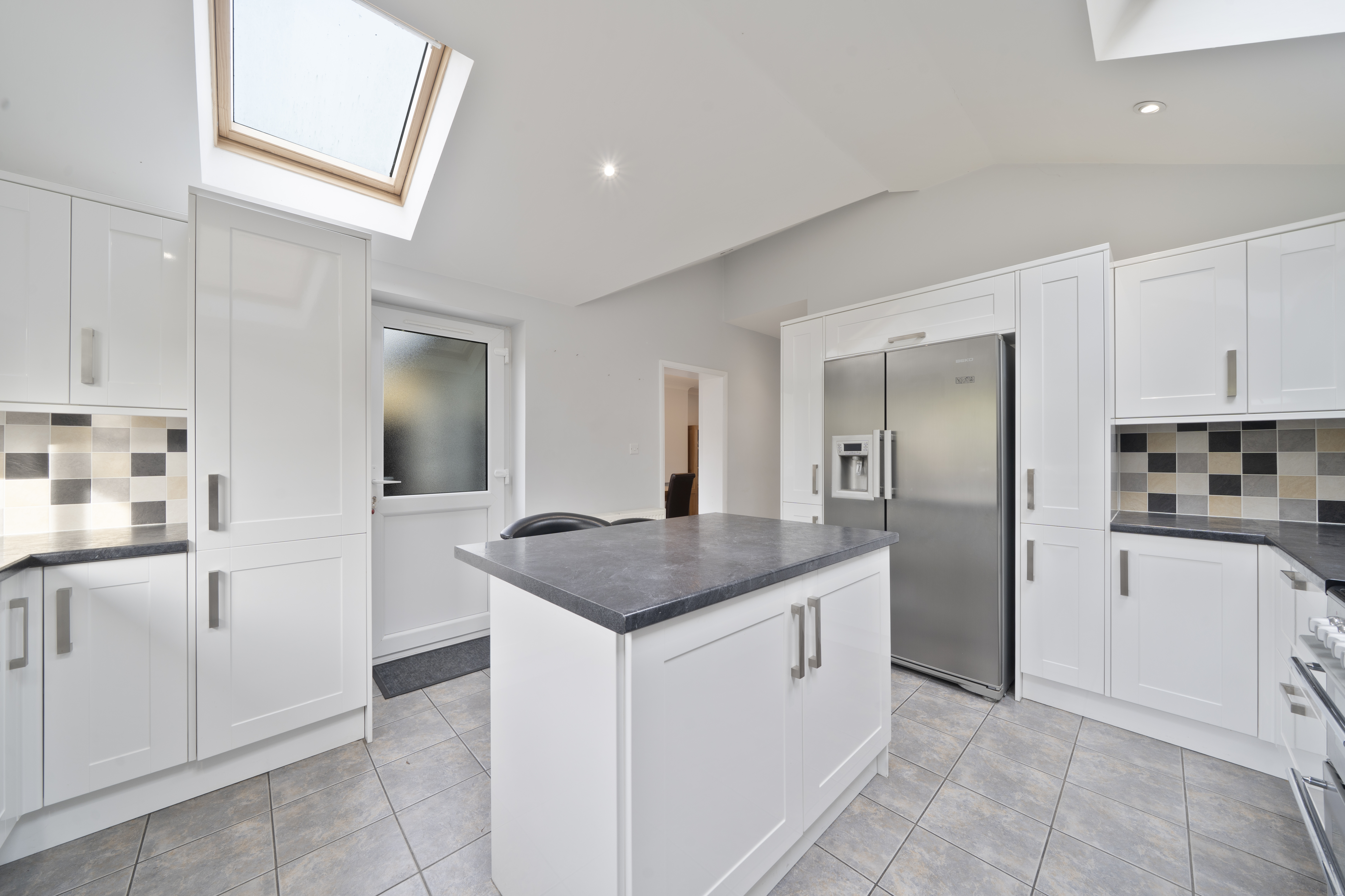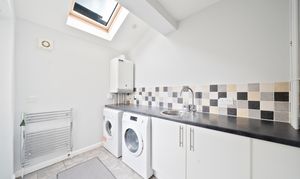 The ground-floor comprises a large kitchen complete with separate utility room, offering ample storage space and functionality. The kitchen is fitted with units, a stainless-steel sink and island and is complete with a large cooker and fridge-freezer. A lounge/diner is provided with access into the rear garden, while a ground-floor WC is a convenient addition for guests. Upstairs, two double bedrooms and one single bedroom are provided, along with the family bathroom. Gas central heating is supplied throughout.