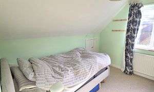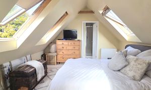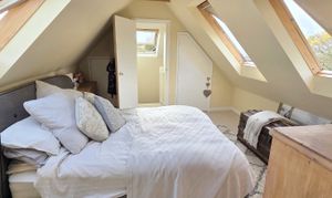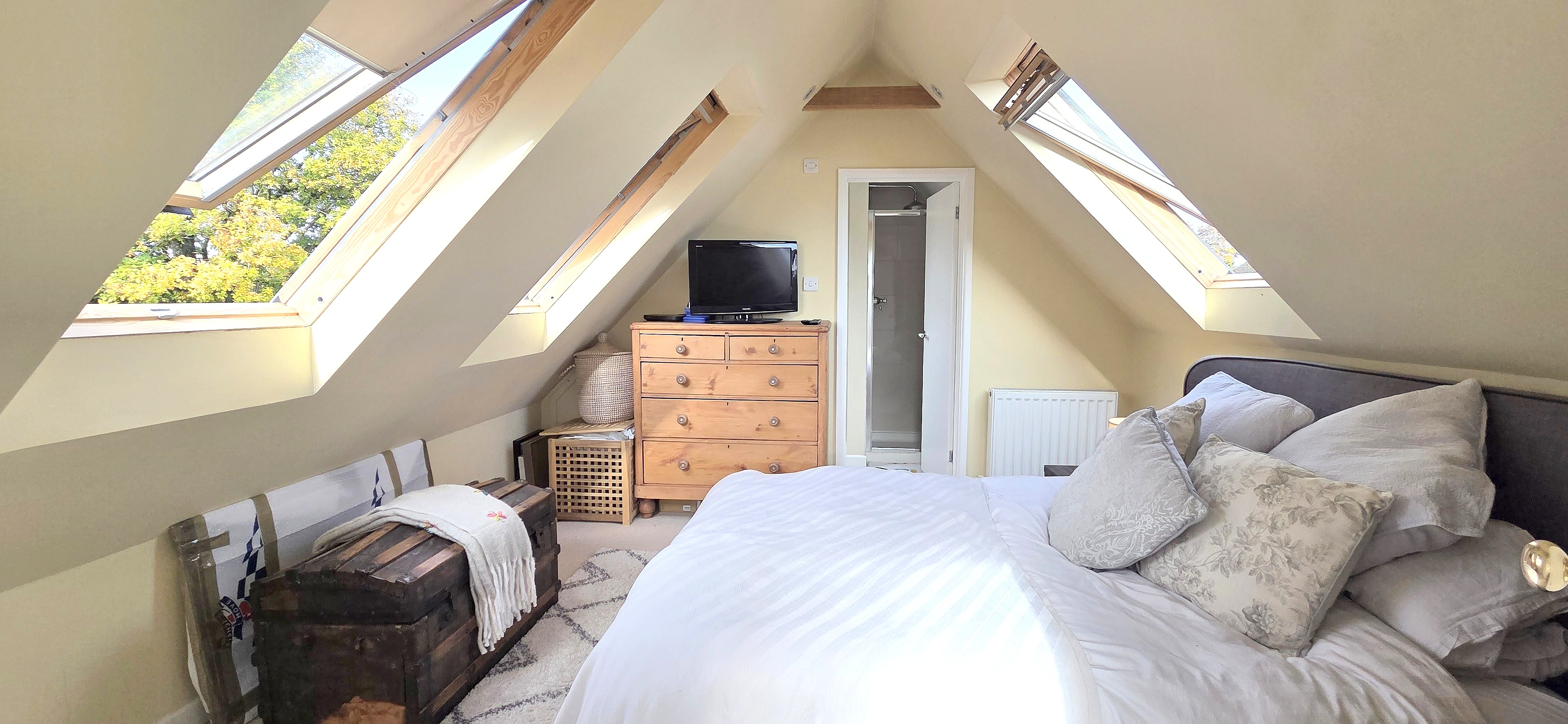 - Second Floor – Principle Suite with plenty of character, vaulted ceiling, exposed oak and skylights + distant views to the South Downs + En-Suite Shower Room