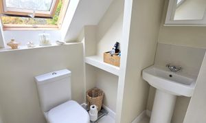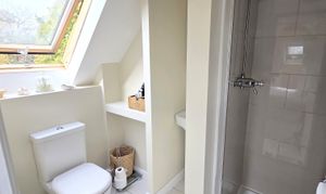 Second Floor – Principle Suite plenty of character, vaulted ceiling, exposed oak and skylights with distant views to the South Downs and adjoining En-Suite Shower Room fitted white suite.