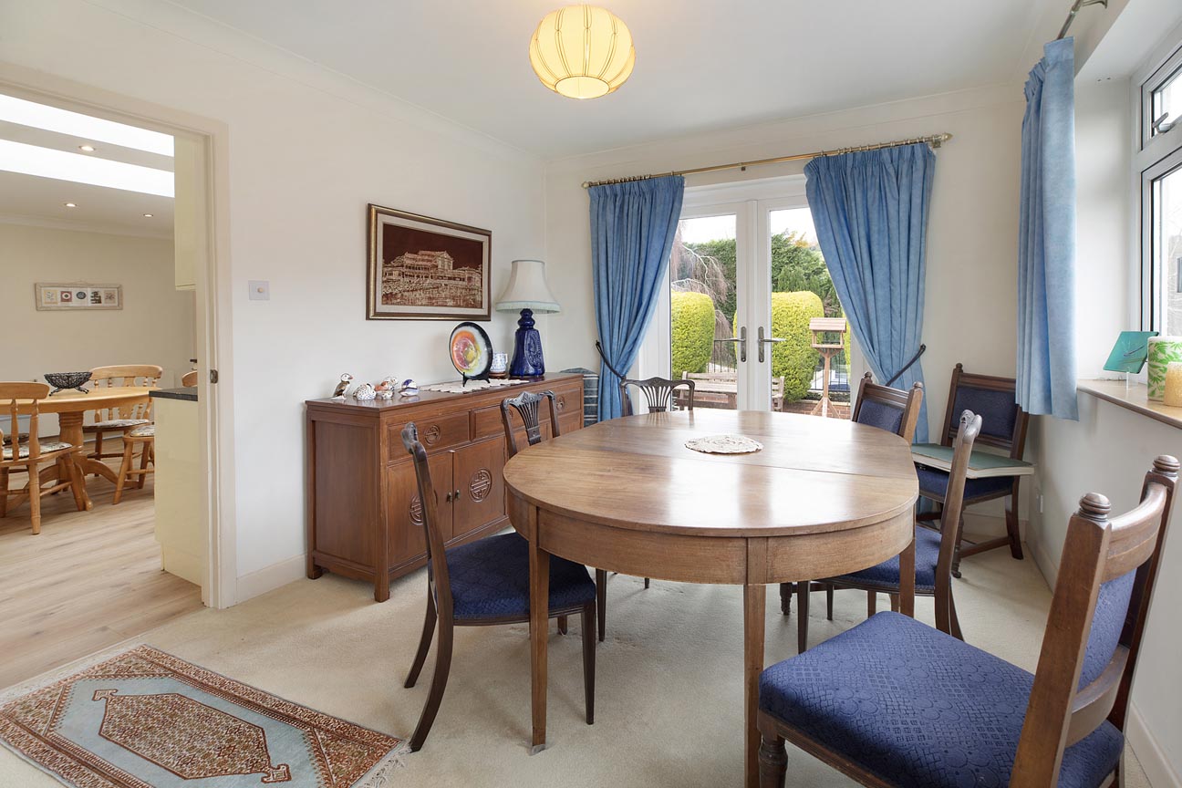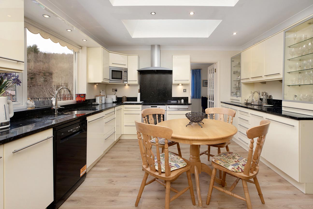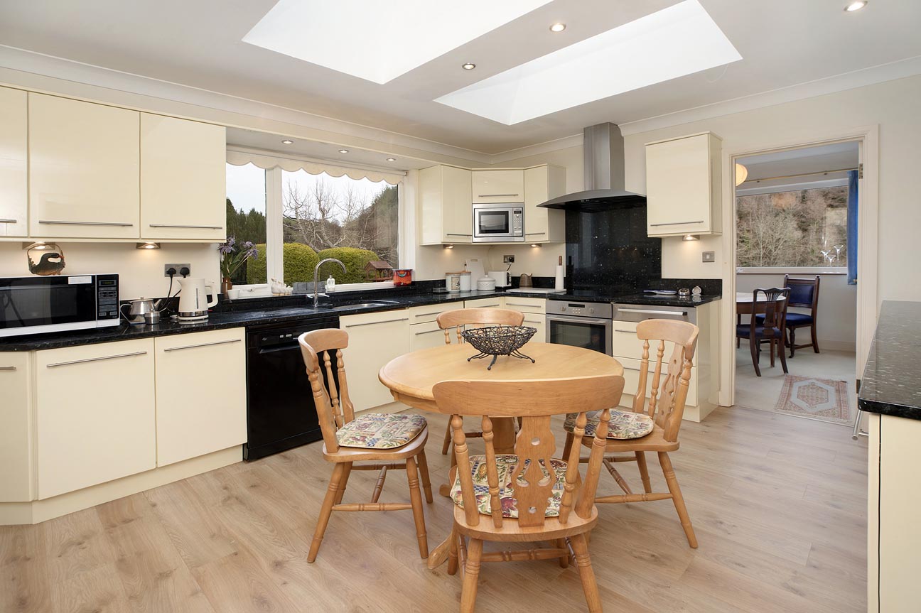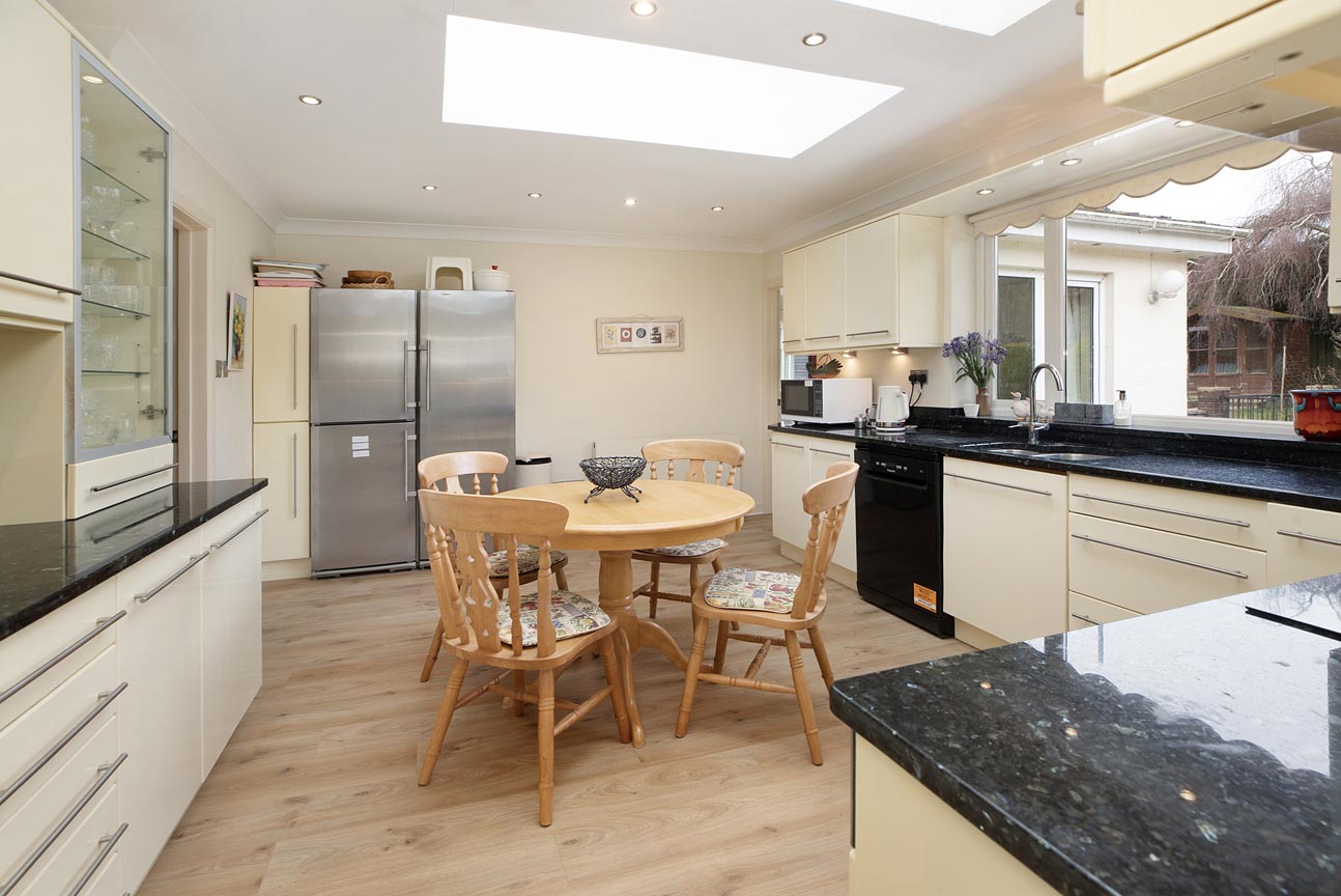 An arched doorway connects through to the elegant dining room, perfectly suited for family gatherings or formal entertaining, with double patio doors leading out to the garden, lovely views over the gardens and forest beyond. Adjacent lies the bright and sociable kitchen/breakfast room – the true heart of the home – flooded with natural light from skylights overhead. It features cream cabinetry, black granite work surfaces, integrated appliances (oven, hob, extractor, dishwasher), and ample space for a central breakfast table, making it ideal for casual meals and morning coffees.