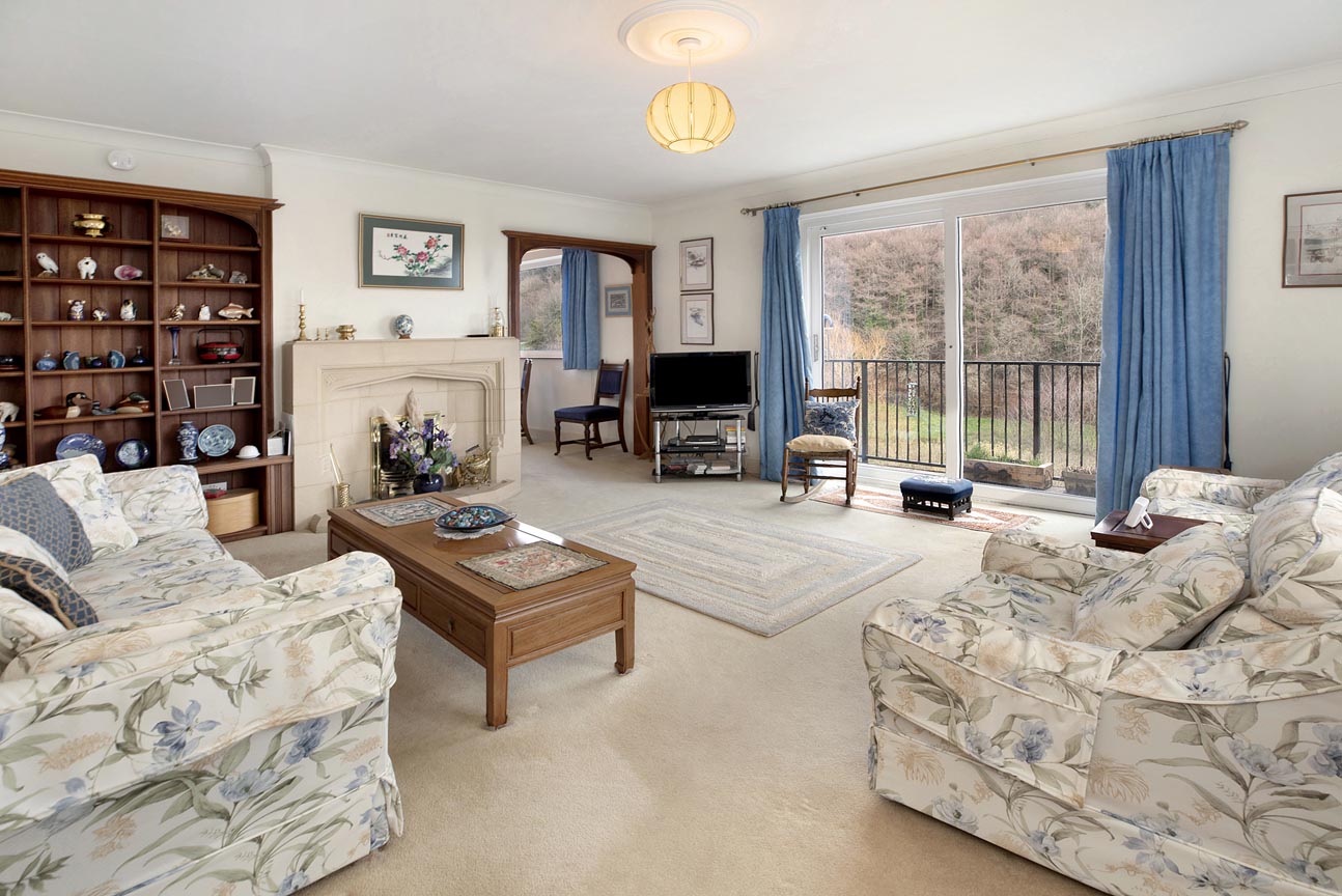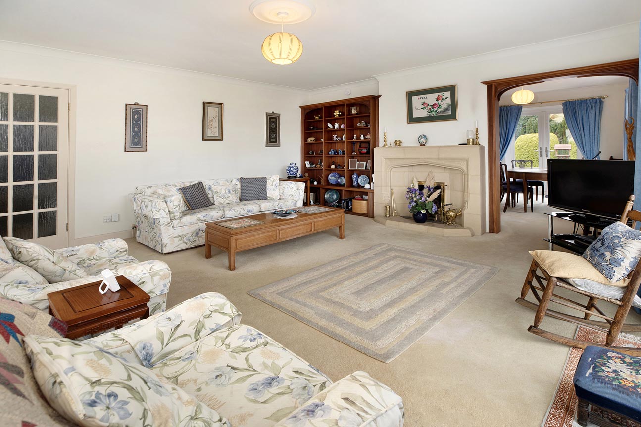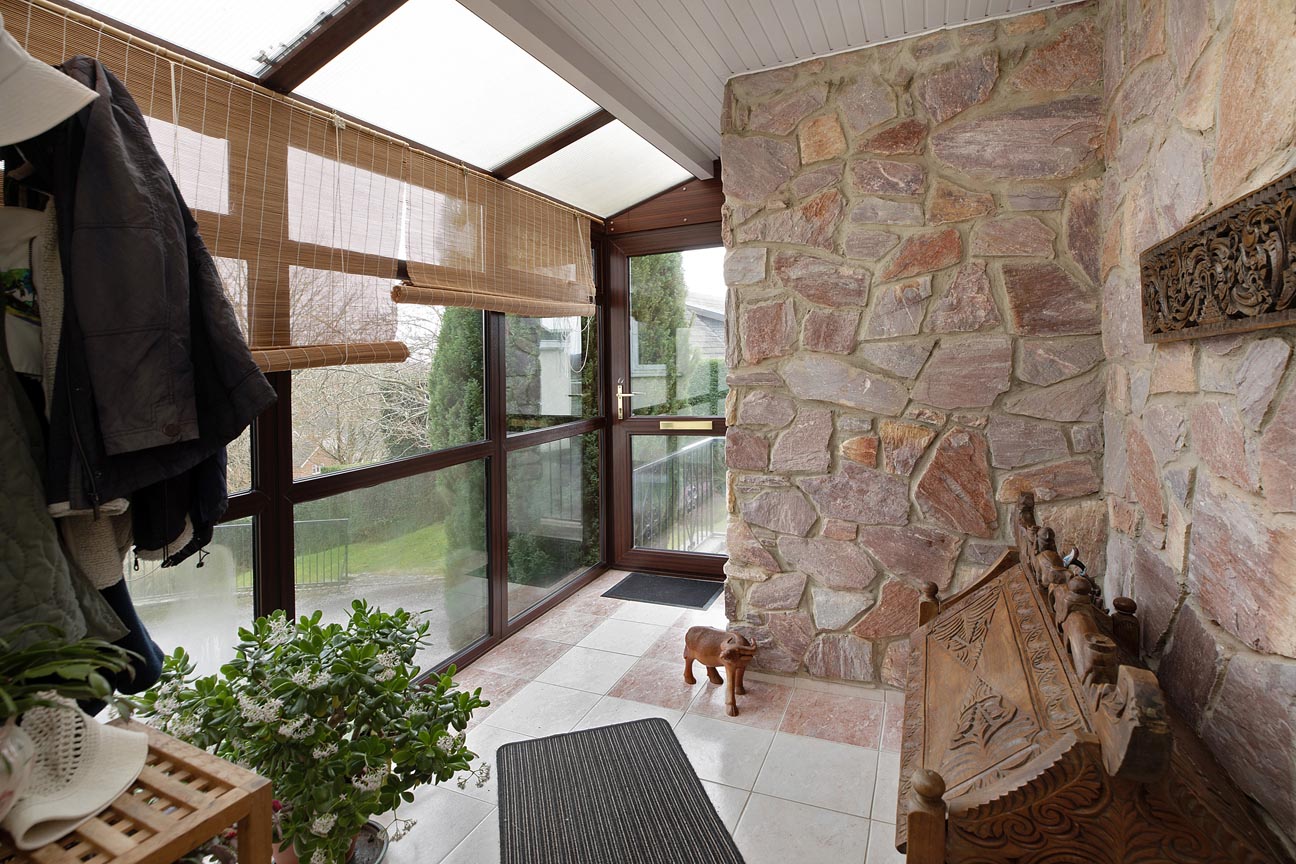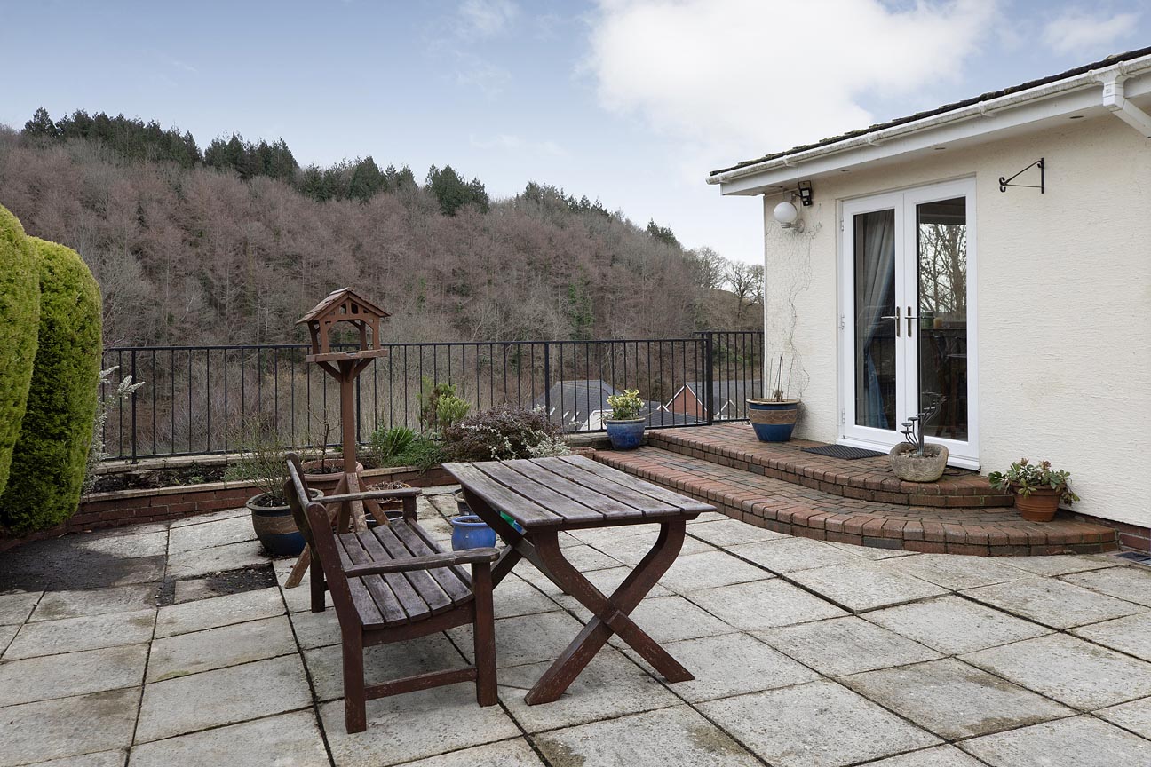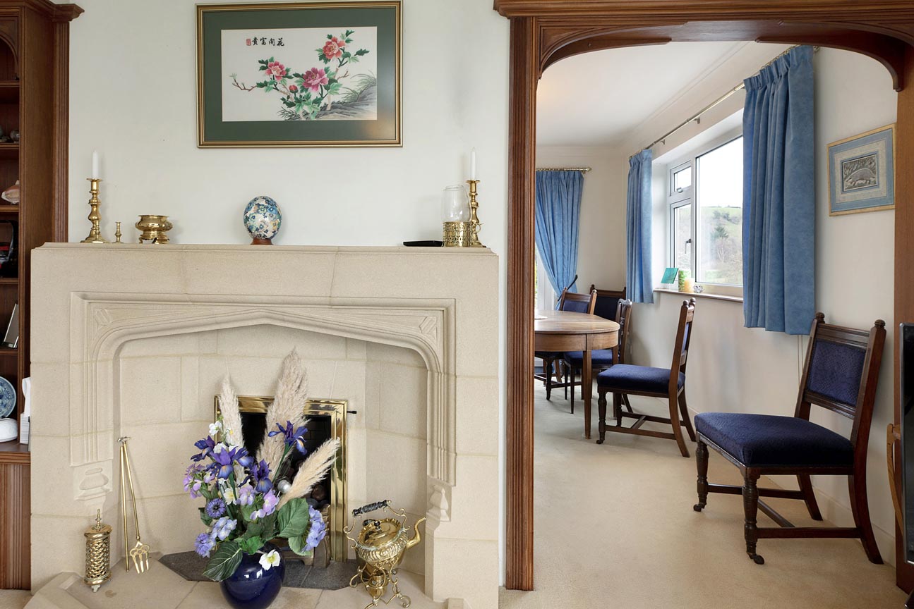 As you enter through the welcoming stone porch it leads into a spacious and light-filled entrance hallway, which is complete with a practical storage cupboard and elegant arched opening that sets a graceful tone for the home. From here, step directly into the impressive lounge, a generous and cosy focal point with a beautiful stone fireplace, large windows capturing the stunning valley outlook, and a patio door allowing you to open seamlessly to the rear terrace for effortless indoor-outdoor flow.