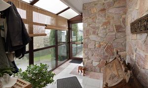 - Cosy lounge featuring a striking stone fireplace