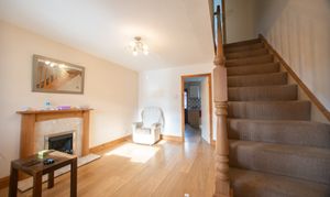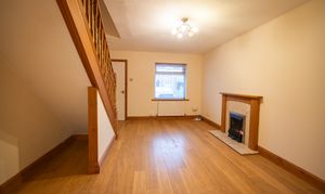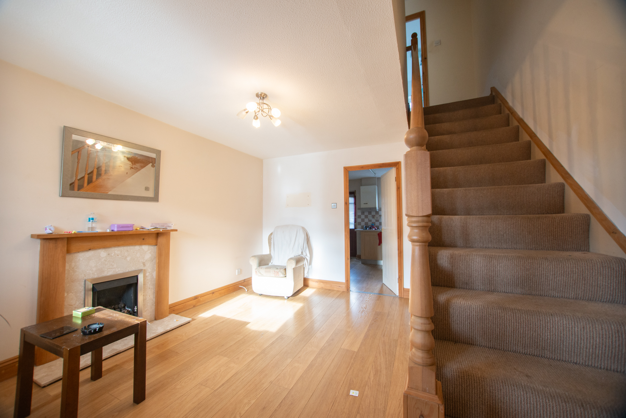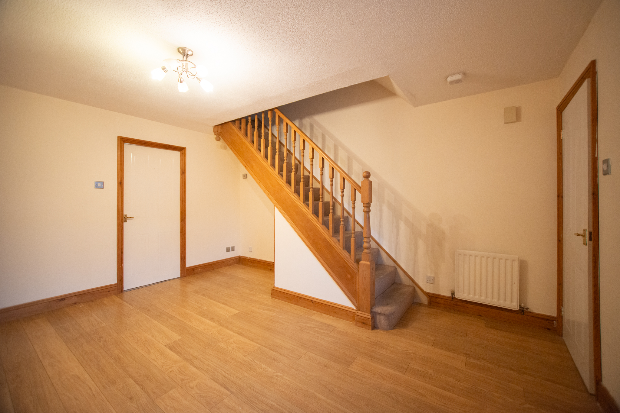 The property benefits from a large living room with stairs leading to the upper floor, as well as a spacious kitchen to the rear. Upstairs, there are two large bedrooms and a neutral family bathroom.